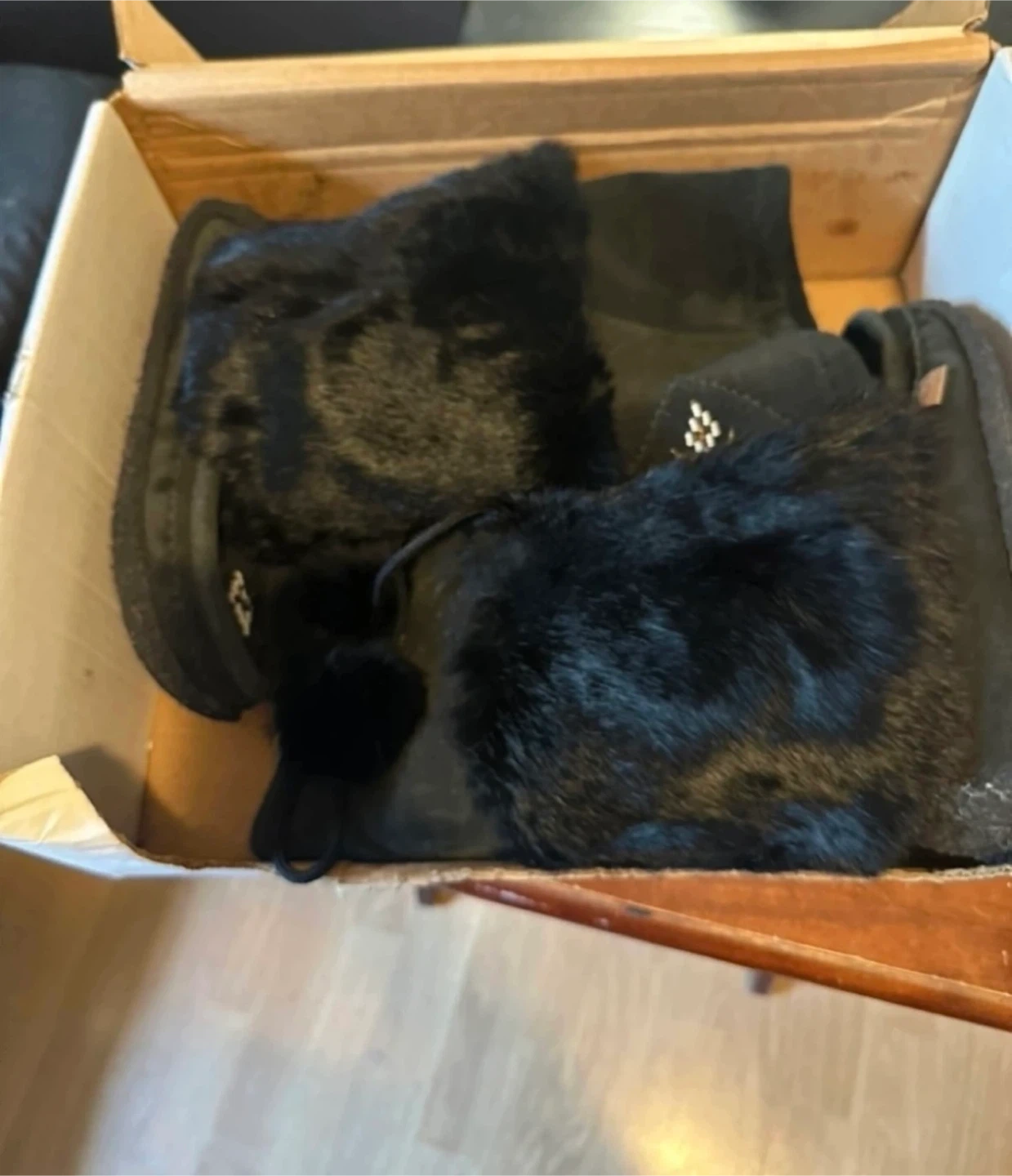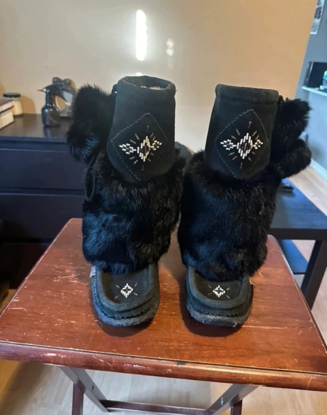Cozy and stylish Manitobah Mukluks boots in size 7. These boots are black and feature beautiful beadwork and fur trim. Perfect for keeping your feet warm during the Canadian winter