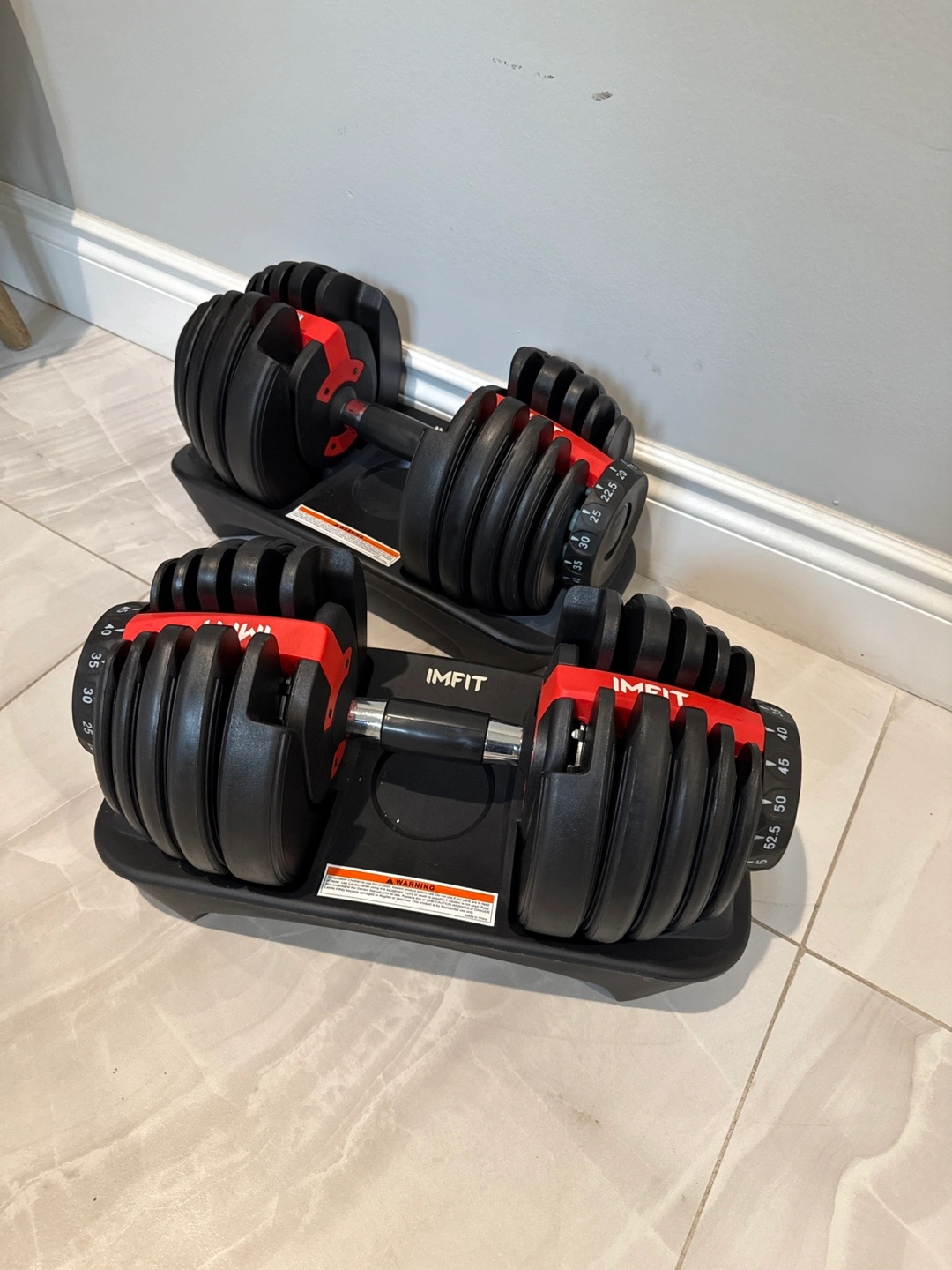 Selling a pair of IMFIt adjustable dumbbells. These are in great shape and ready for your home gym! They have a black and red design.