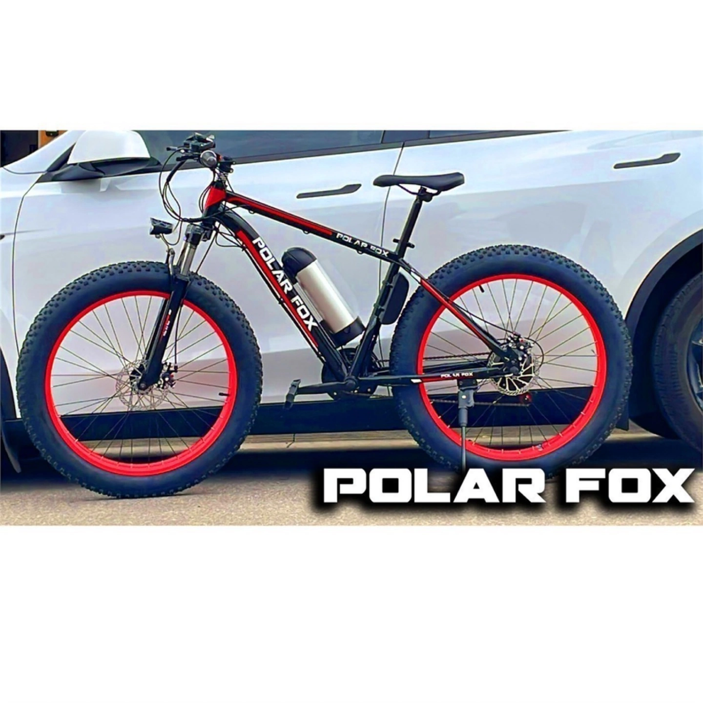 Selling a Polar Fox electric fat tire bike! It features 21 speeds and front shocks for a smooth ride. The bike is black with red accents, making it stand out. Perfect for cruising around town or hitting the trails!
