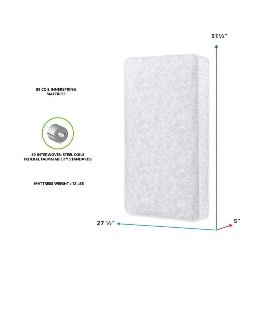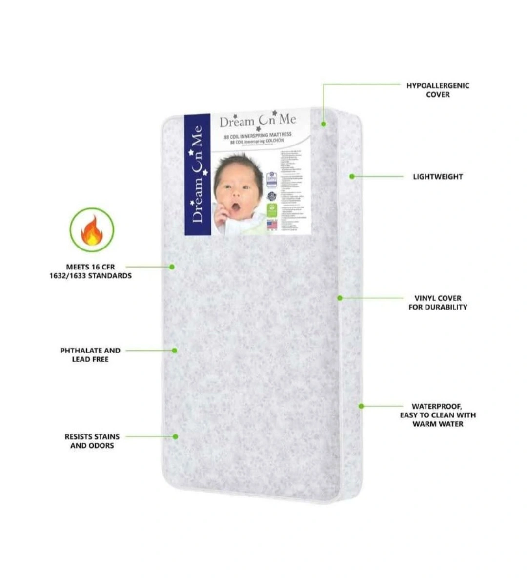 Looking to give your little one a comfy and safe sleep space? This Dream On Me crib mattress is just the ticket! It's designed with an 88-coil innerspring system for support and meets federal flammability standards. Plus, the hypoallergenic cover is easy to clean with warm water, resisting stains and odours. Mattress weight is 12 lbs, and it measures 51½" x 27½" x 5".