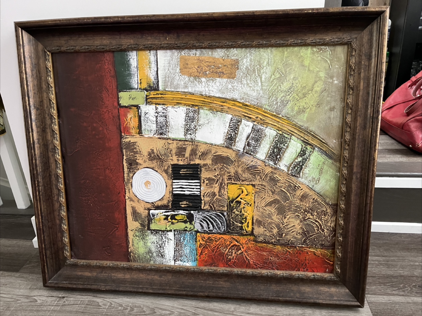 This is a framed abstract painting with a textured surface and a variety of colours, including red, green, yellow, and brown. It would be a great addition to any home.
