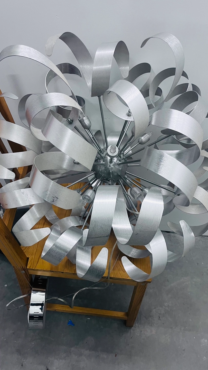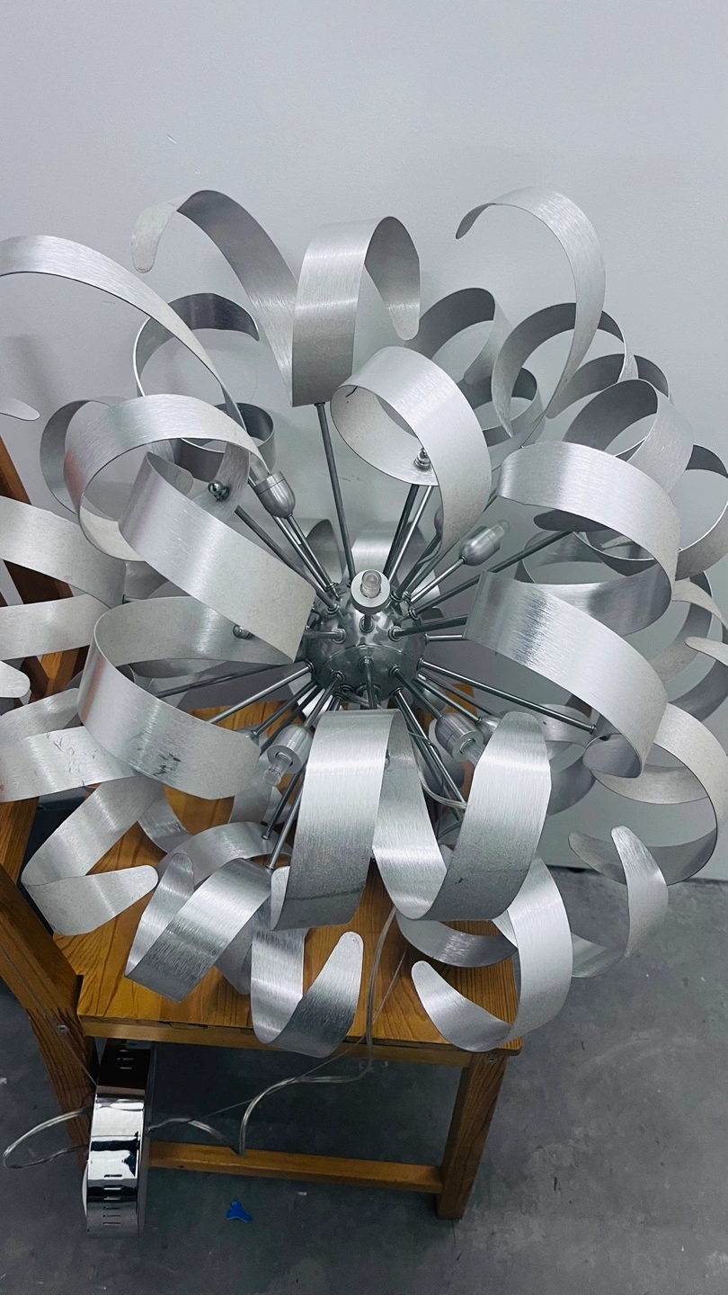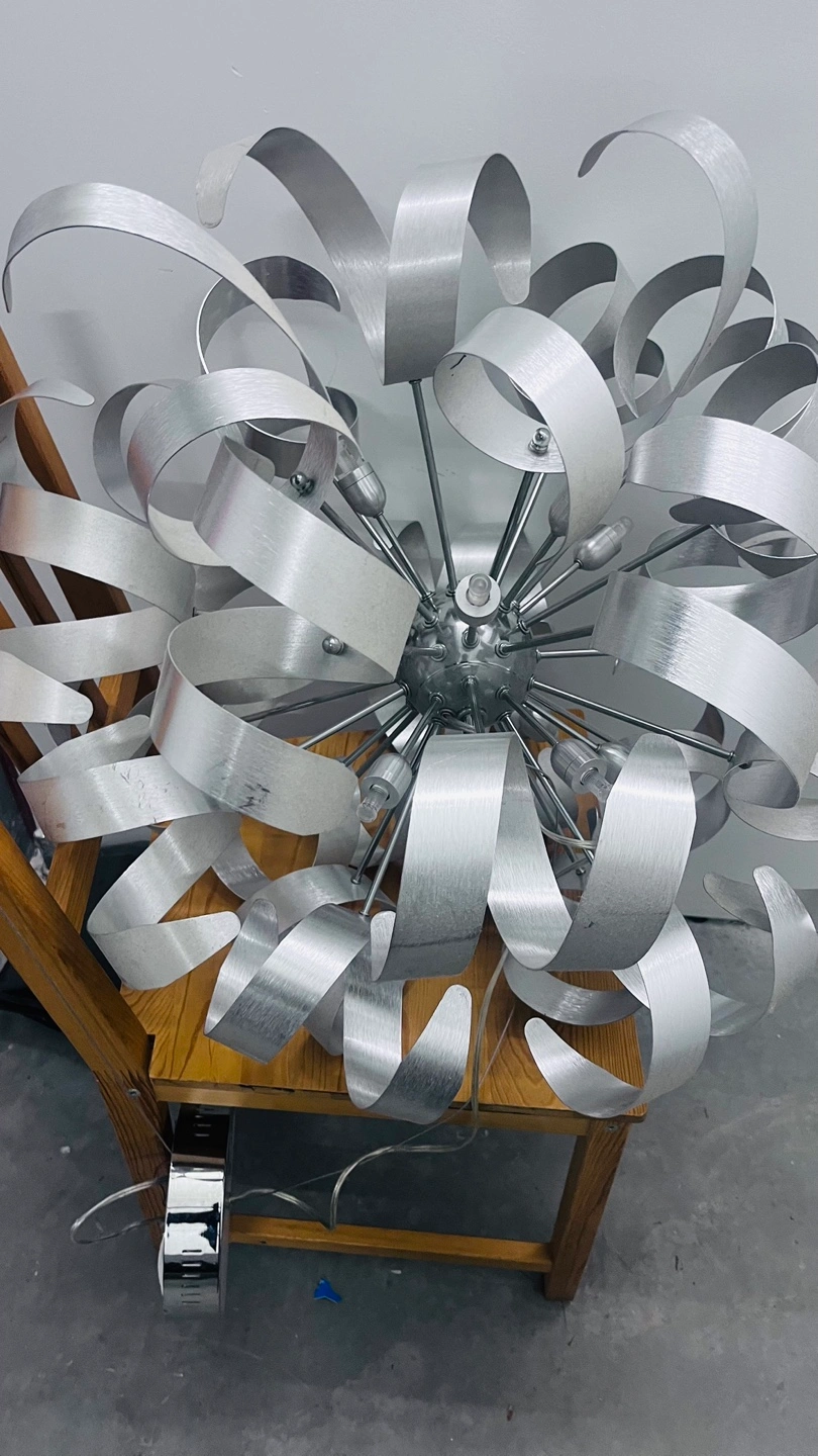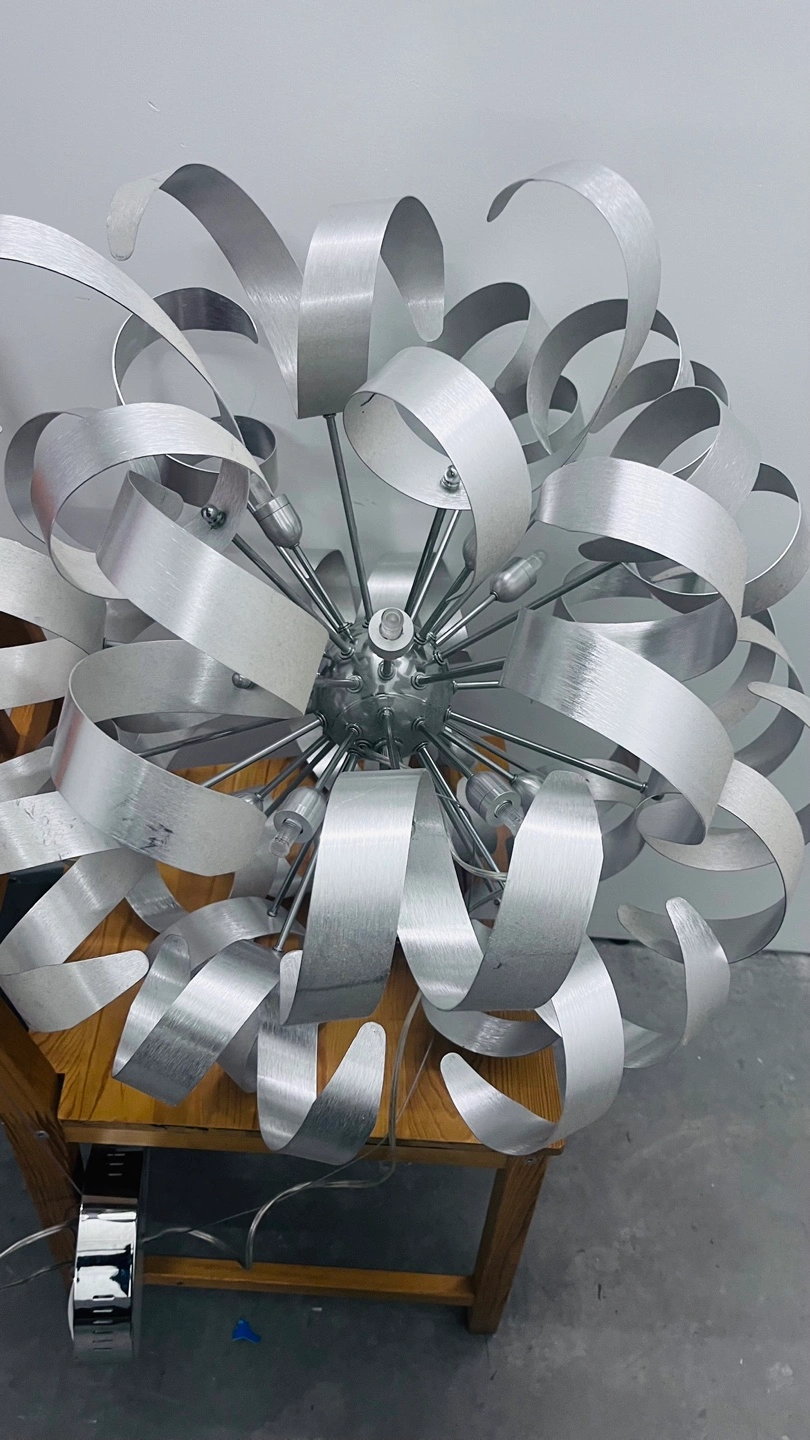 76Selling a unique silver sputnik-style chandelier! It's a real statement piece that would look amazing in any room. The design features swirling silver metal ribbons around a central sphere with multiple lights. It's in great condition and ready to brighten up your space