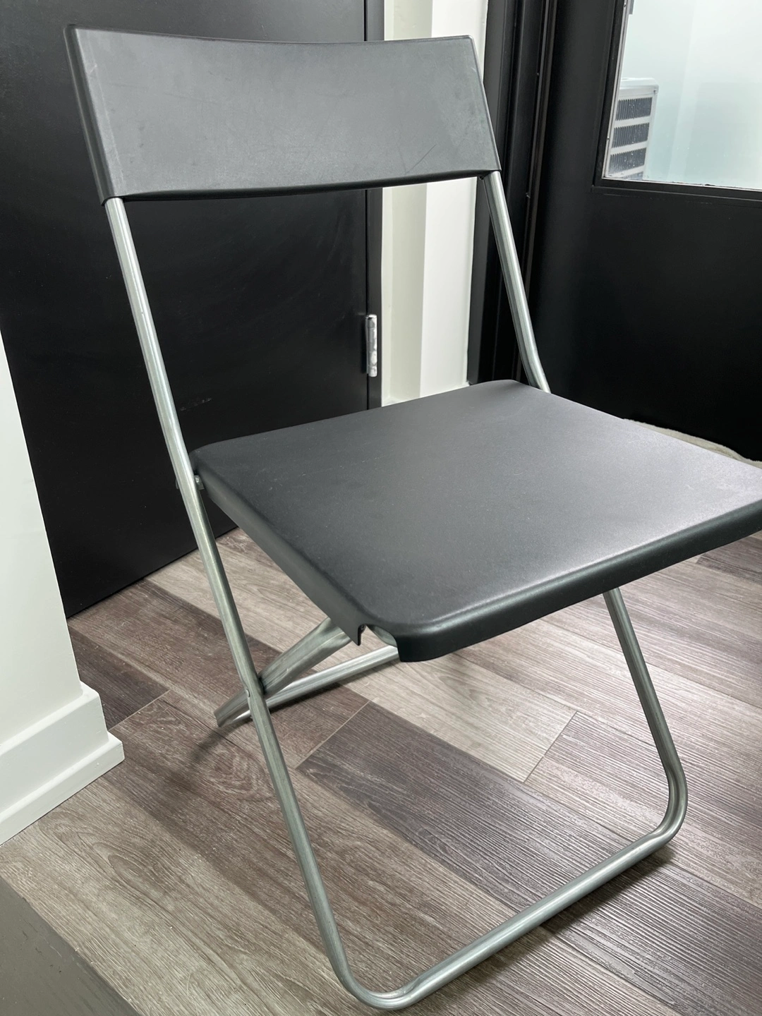 This is a black folding chair. It's perfect for extra seating when you have guests over or for small spaces. It's in great condition and ready for a new home