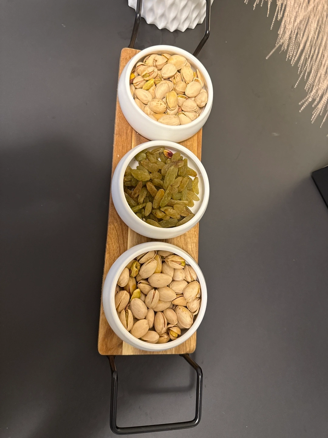 798Selling a cute serving tray with three white bowls! It's perfect for serving snacks or appetizers to your guests. The tray is made of wood and has a black metal handle for easy carrying. The bowls are a great size for nuts, candies, or dips