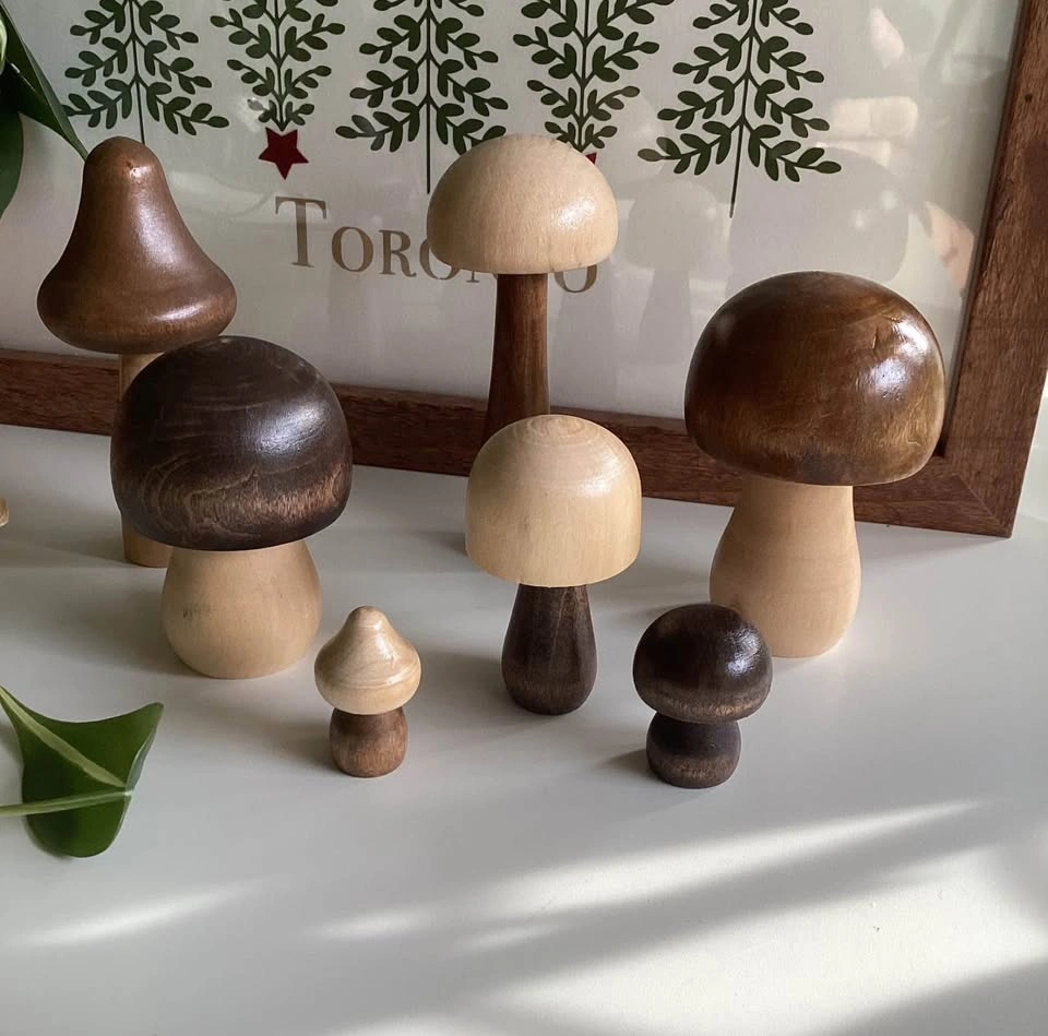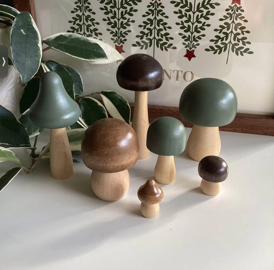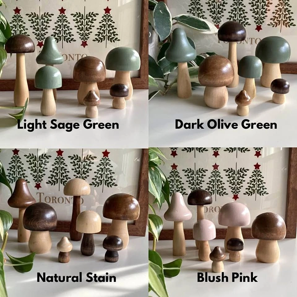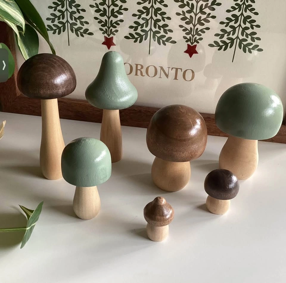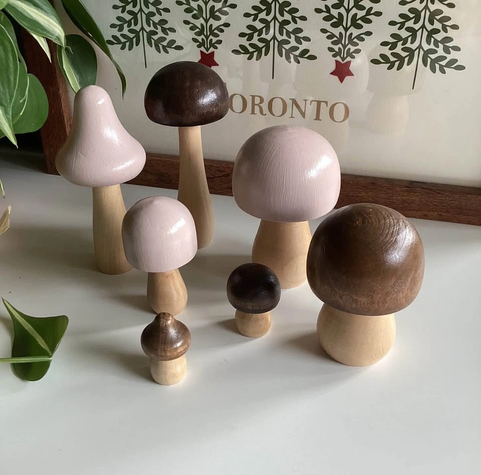Adorable sets of 7 hand painted and stained mushrooms (by me). A touch of nature decor item for the holidays or anytime of year for your plant shelf, a nursery, or a whimsical touch anywhere in your home. Ranging in height from 1.25” to 4”. I’ve just finished my last sets so I have a multiple available. Once they’re gone thats it. Light Green (2 sets available), Dark Green (2 sets available), Pink (1 set available), natural Stain (1 set available) $30 each set. CASH ONLY. Pick up only near Parliament and Bloor.