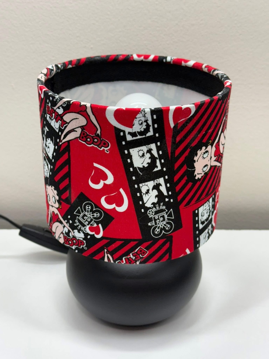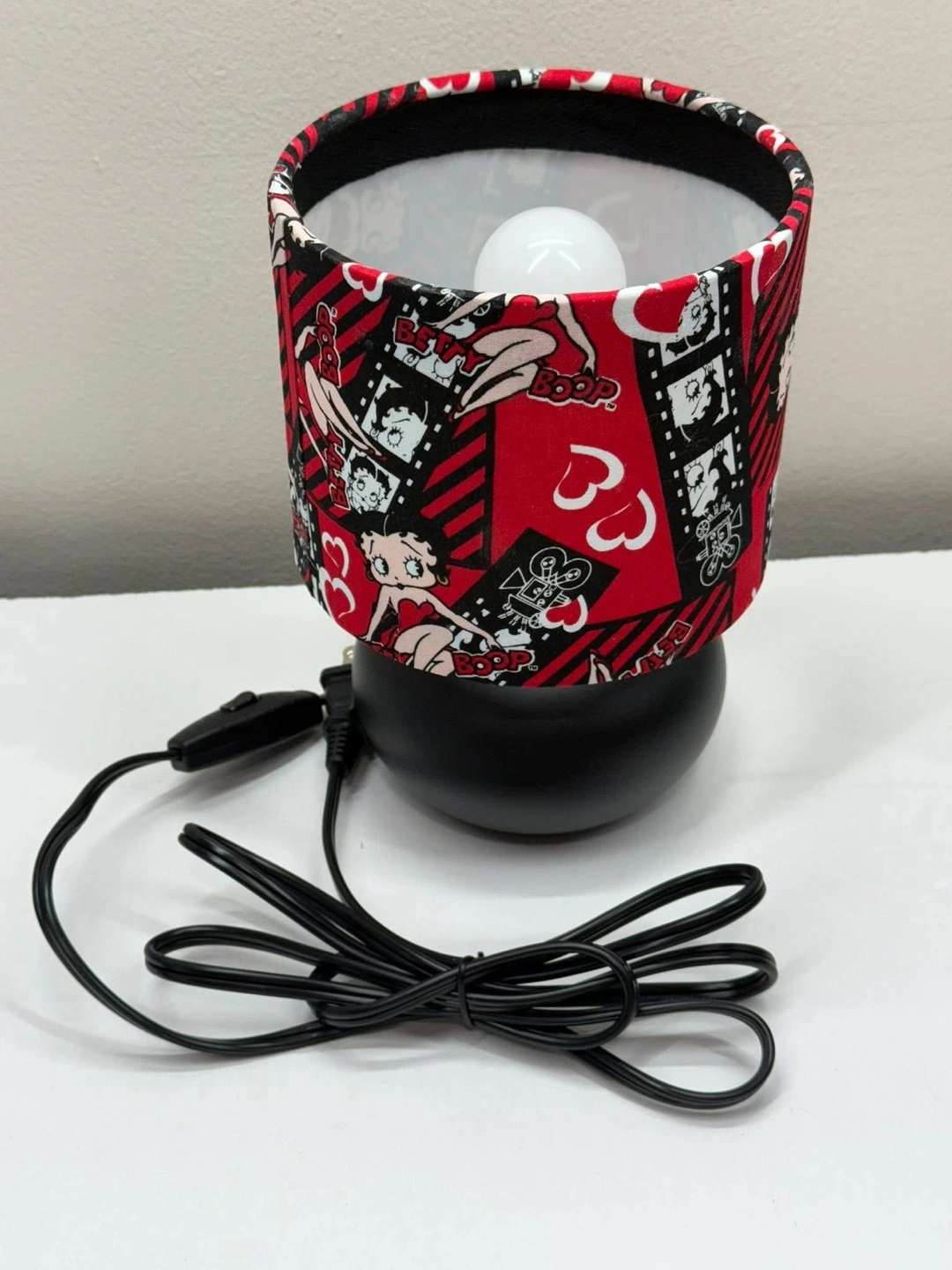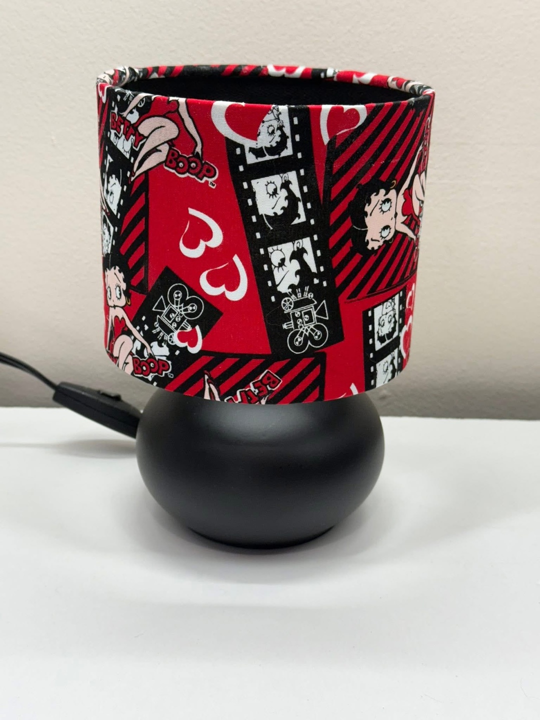 Check out this fun Betty Boop novelty lamp! It has a red, black, and white lampshade with a Betty Boop design. The base is a sleek black colour. It would be a great addition to any room!