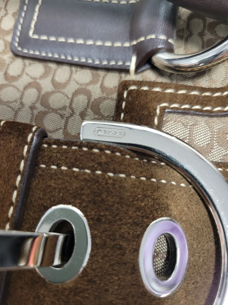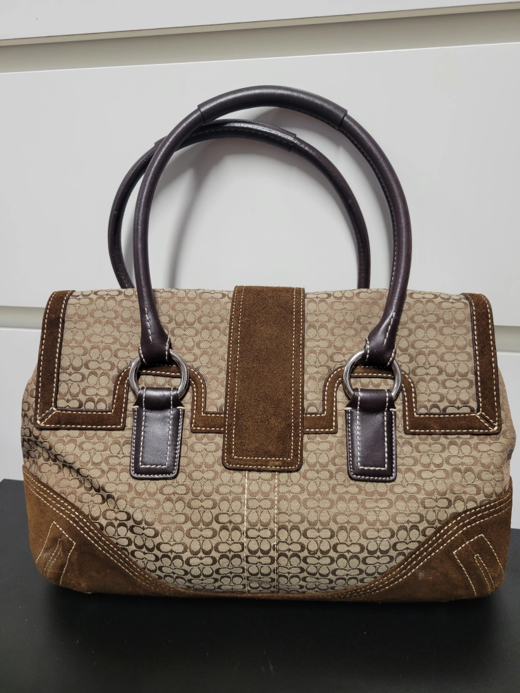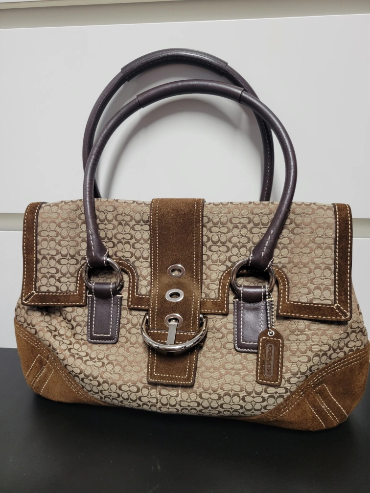 Selling a Coach satchel in brown signature print with suede accents! It's in great condition and perfect for everyday use. The bag features a unique design with a central buckle detail and comfortable handles.