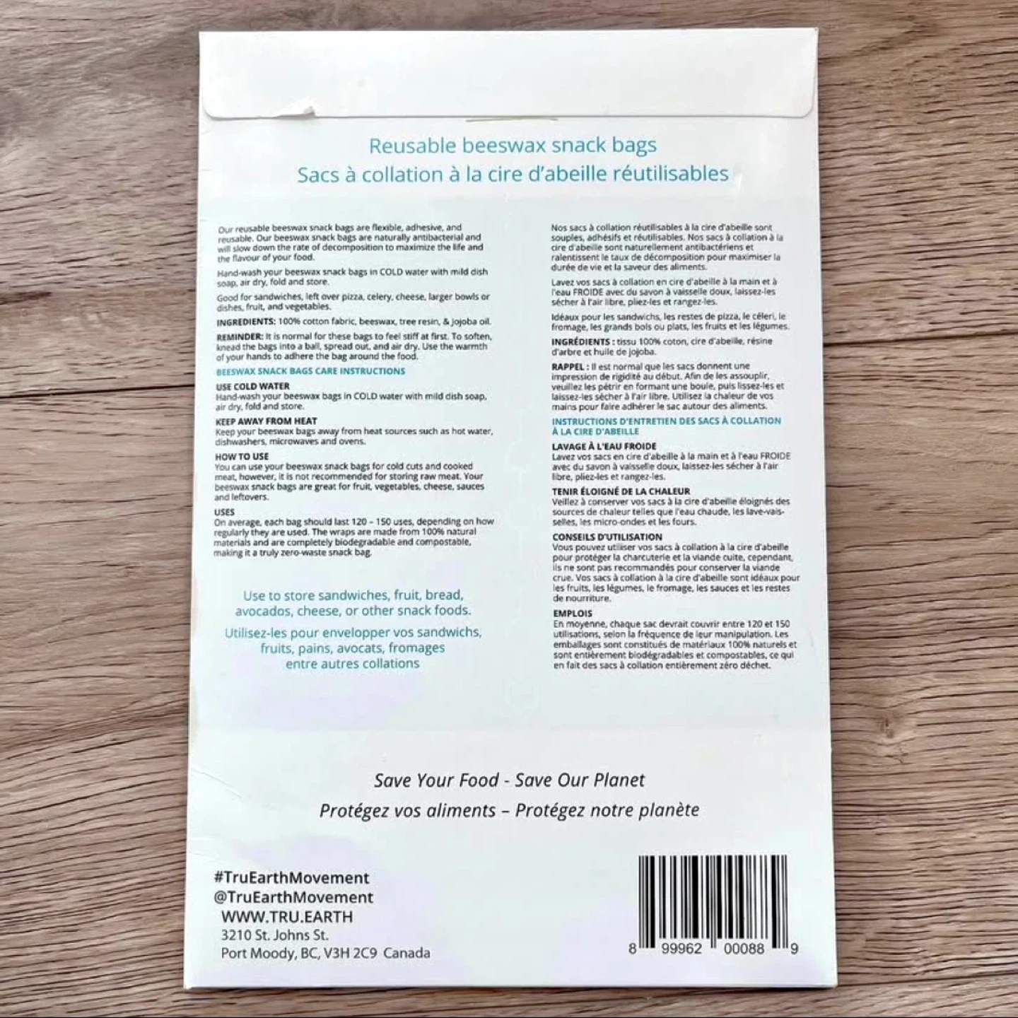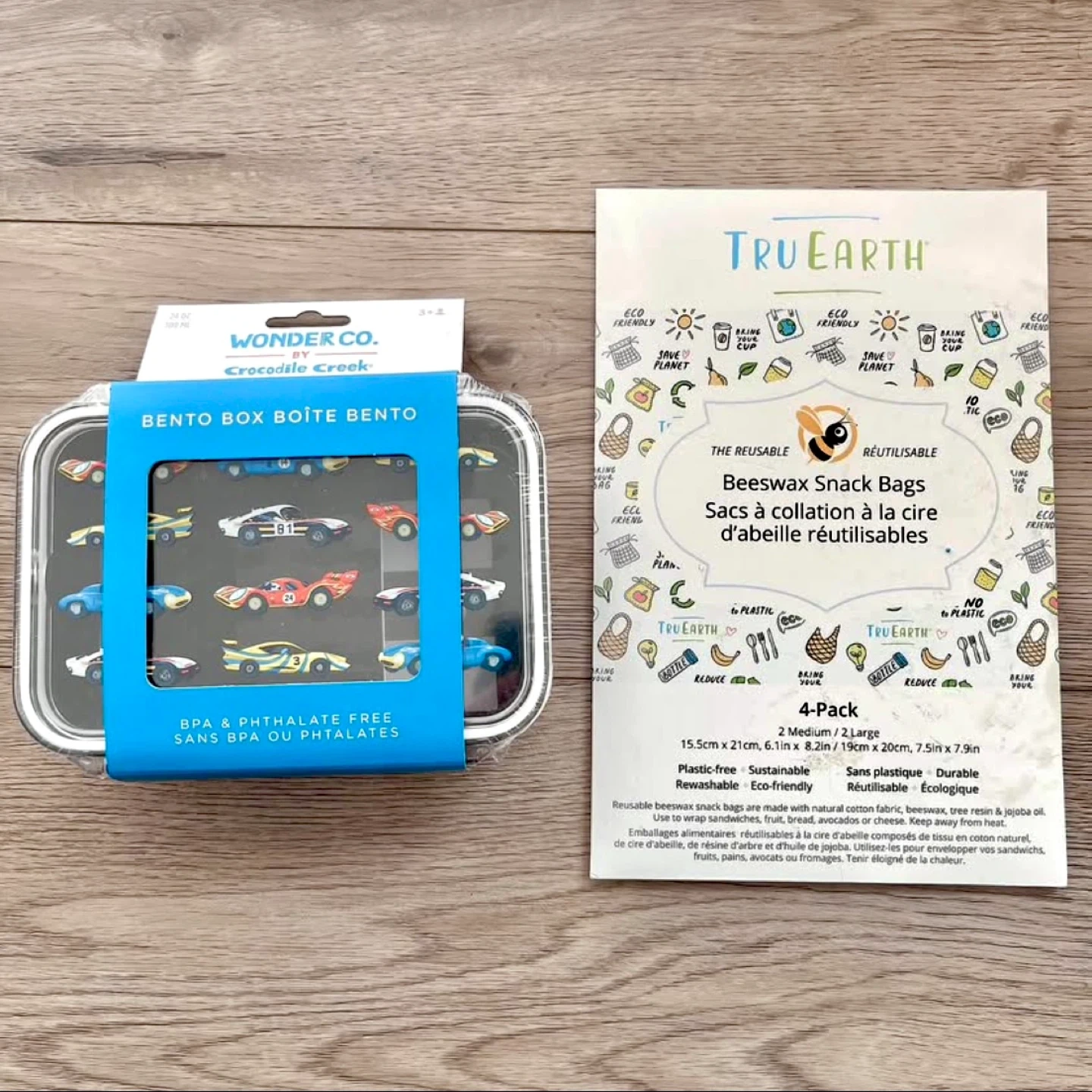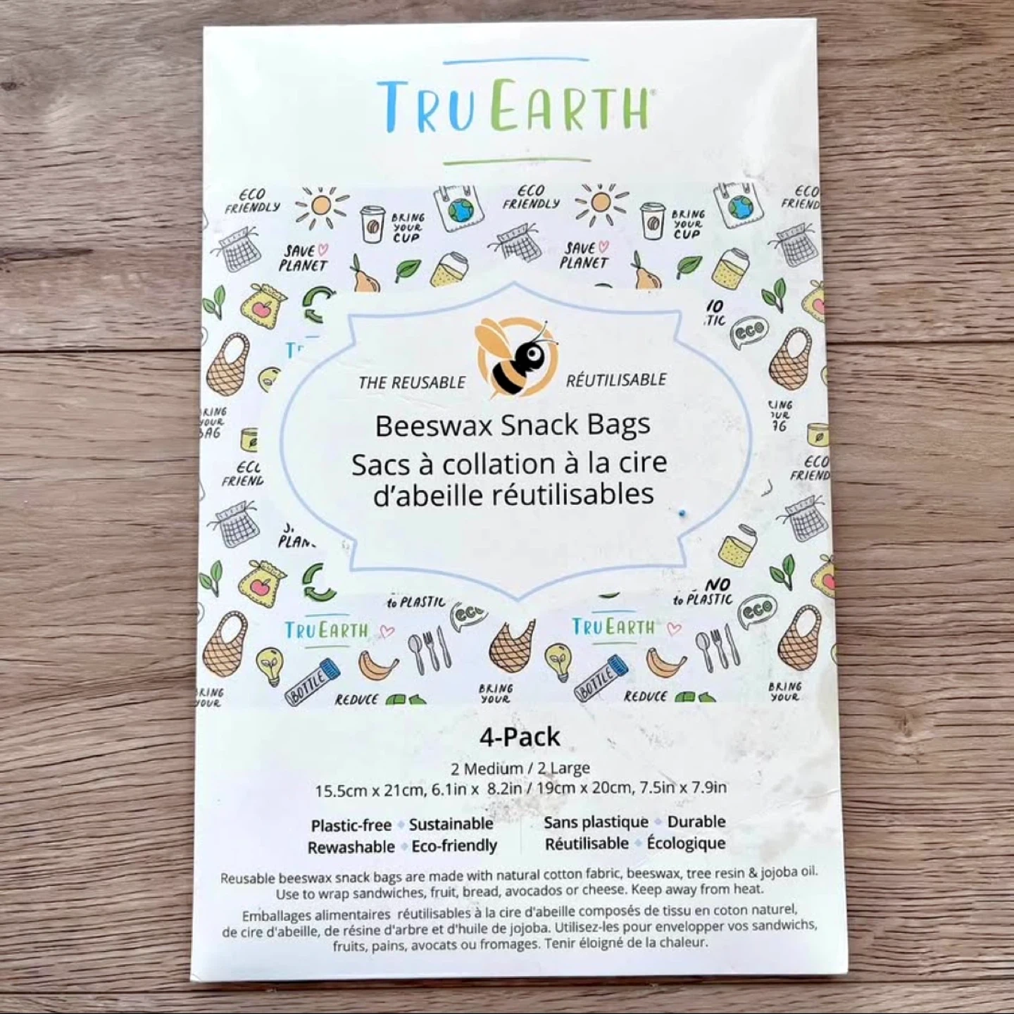I have a set of Tru Earth reusable beeswax snack bags and a Wonder Co. bento box for sale. The Tru Earth snack bags are a 4-pack, with 2 medium (15.5cm x 21cm / 6.1in x 8.2in) and 2 large (19cm x 20cm / 7.5in x 7.9in). They're made with natural cotton fabric, beeswax, tree resin, and jojoba oil. The bento box is BPA and phthalate-free, with easy-to-use clips and a leak-proof lid. It's microwave, freezer, and dishwasher safe.