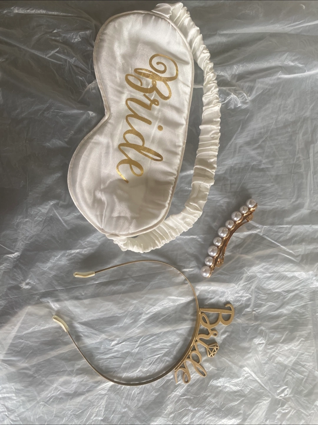 Selling a cute set for a bride-to-be! Includes a white robe with "Bride" on the back, a matching sleep mask, and a few hair accessories. Perfect for getting ready on the big day or a fun bachelorette party