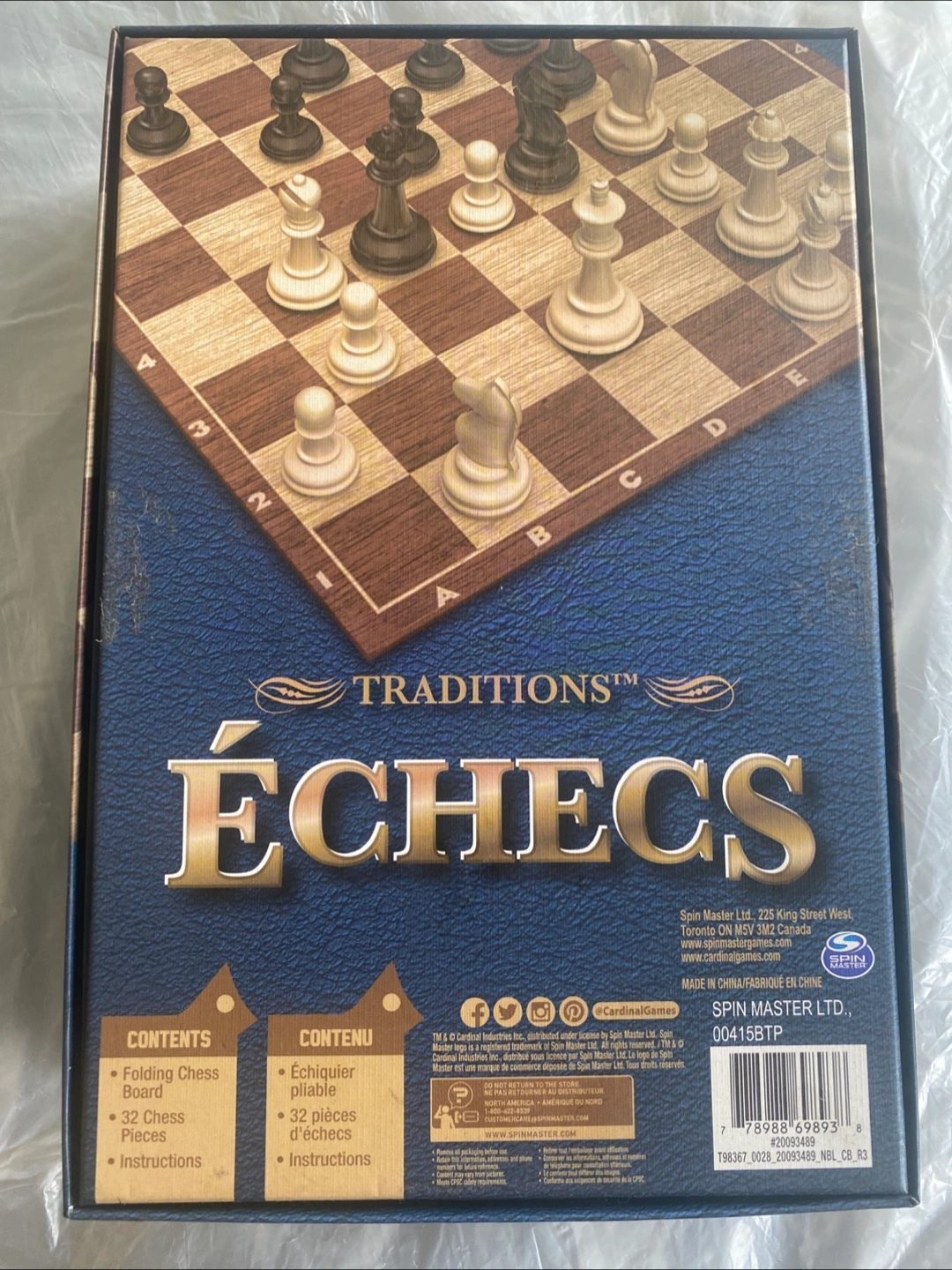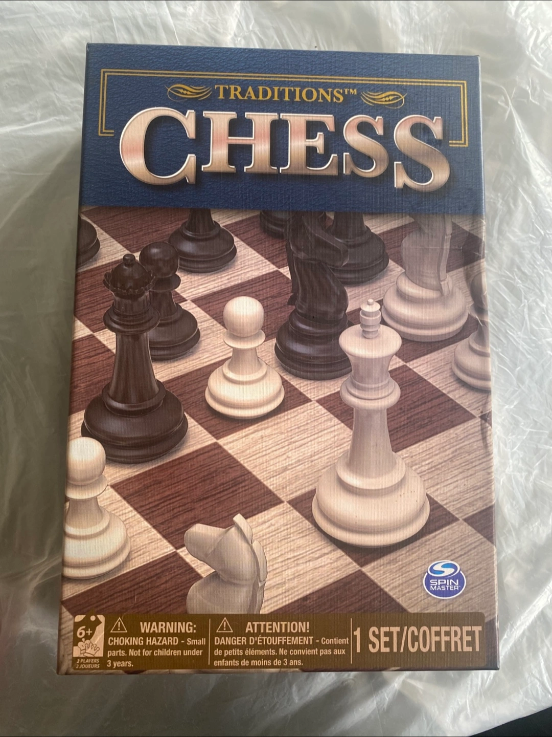 Selling a Traditions chess set by Spin Master! It comes with: - Folding chess board - 32 chess pieces - Instructions Perfect for ages 6+