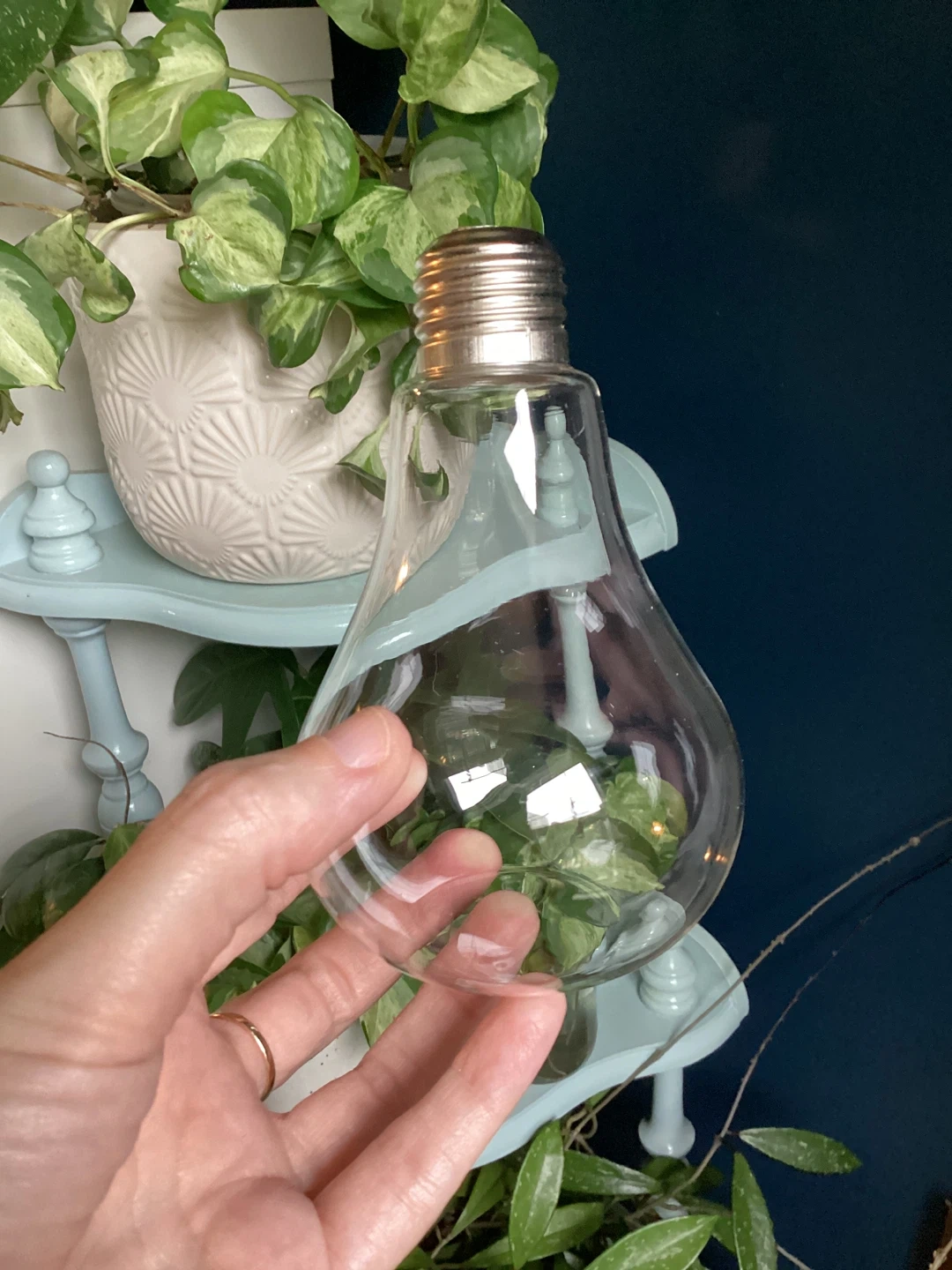 A unique light bulb shaped vase/tiny terrarium or propagation vessel. Has a flat bottom but probably can’t balance for something too heavy as it’s pretty light weight. Could even be pretty filled with crystals or something as decor!