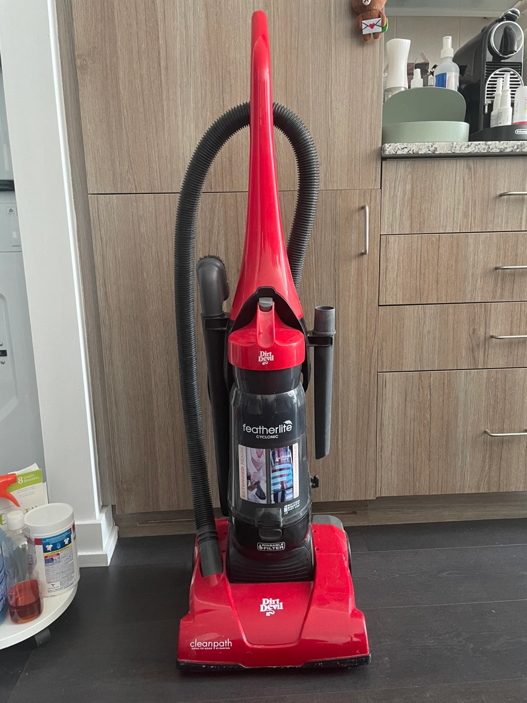 Selling a Dirt Devil Featherlite vacuum cleaner. It's in used condition and has some wear and tear, as you can see in the photos, but still works great!