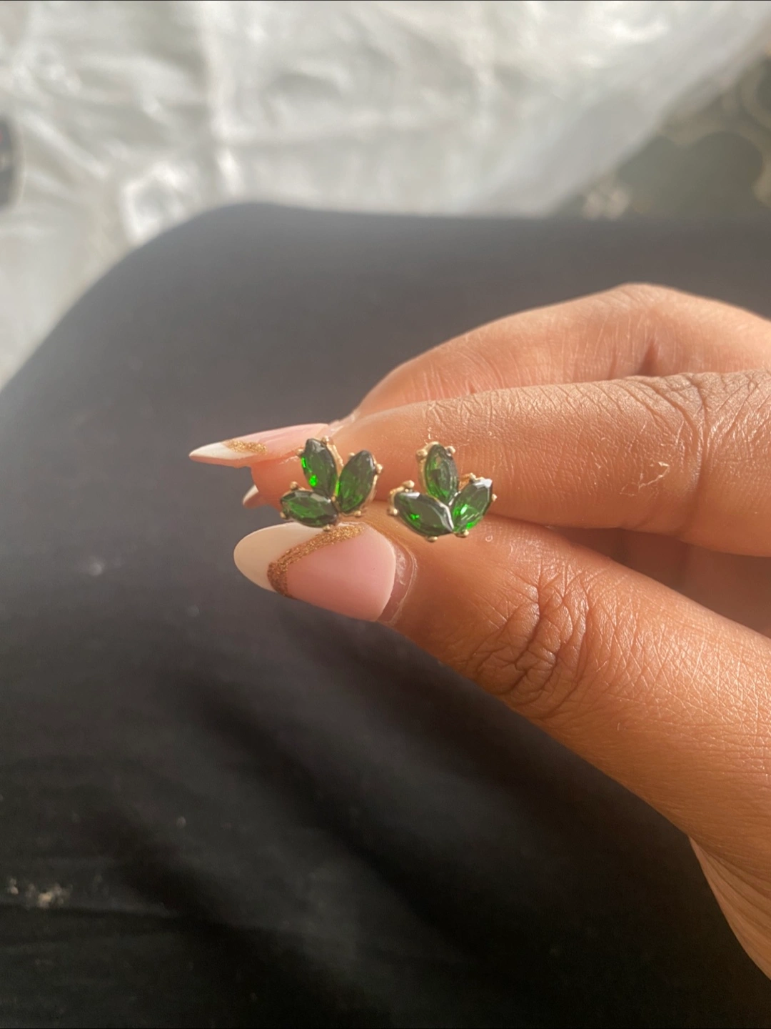 These are a pair of cute leaf-shaped stud earrings! They feature green stones and a gold-tone setting. Perfect for adding a touch of nature to your look