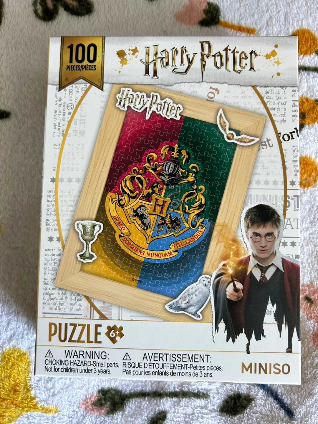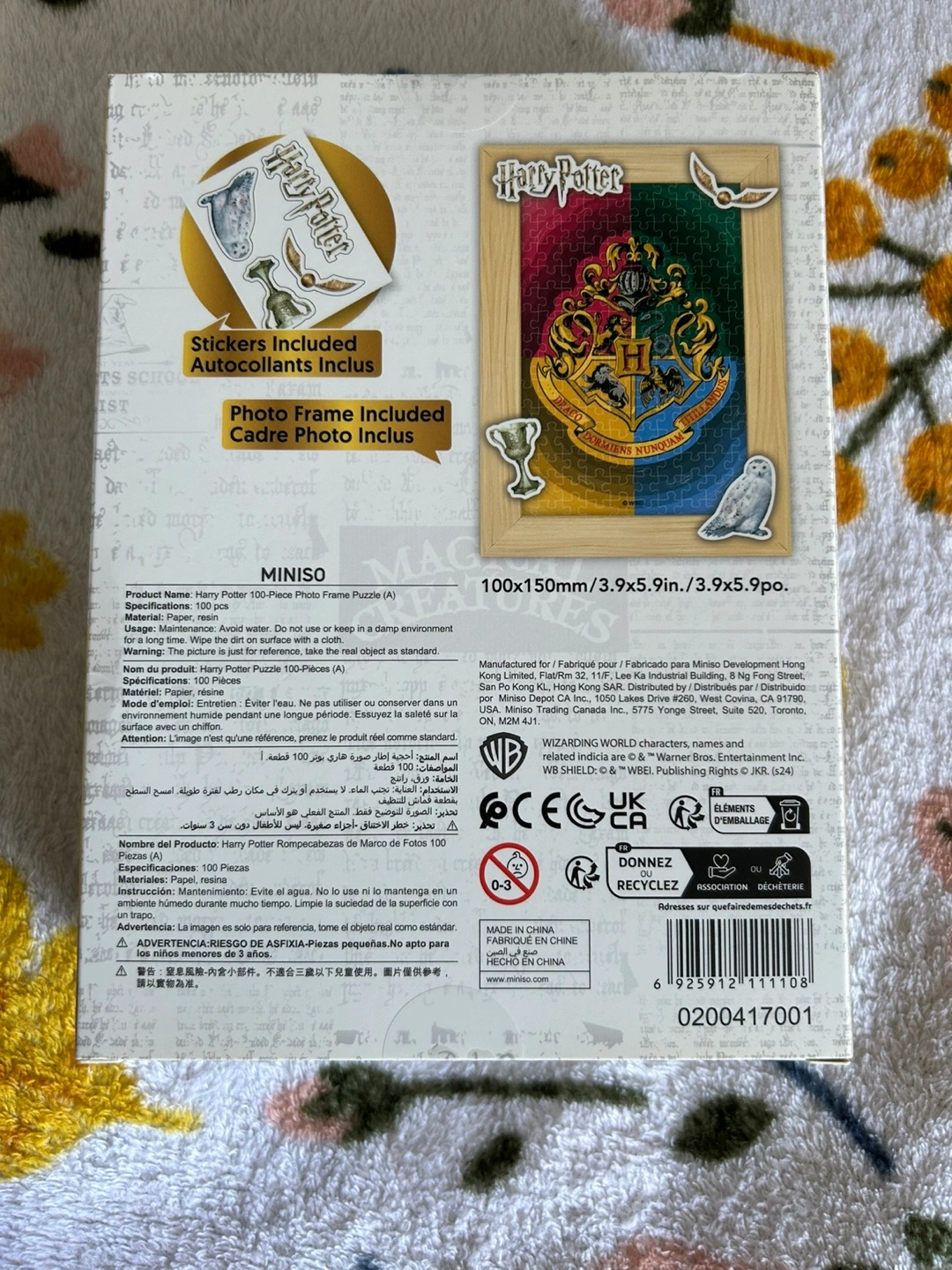 Selling a Harry Potter 100-piece photo frame puzzle by MINISO! It comes with stickers included and a photo frame. Perfect for Harry Potter fans aged 6+! The puzzle's dimensions are 100x150mm / 3.9x5.9in / 3.9x5.9po. Get ready for some magical puzzling fun!