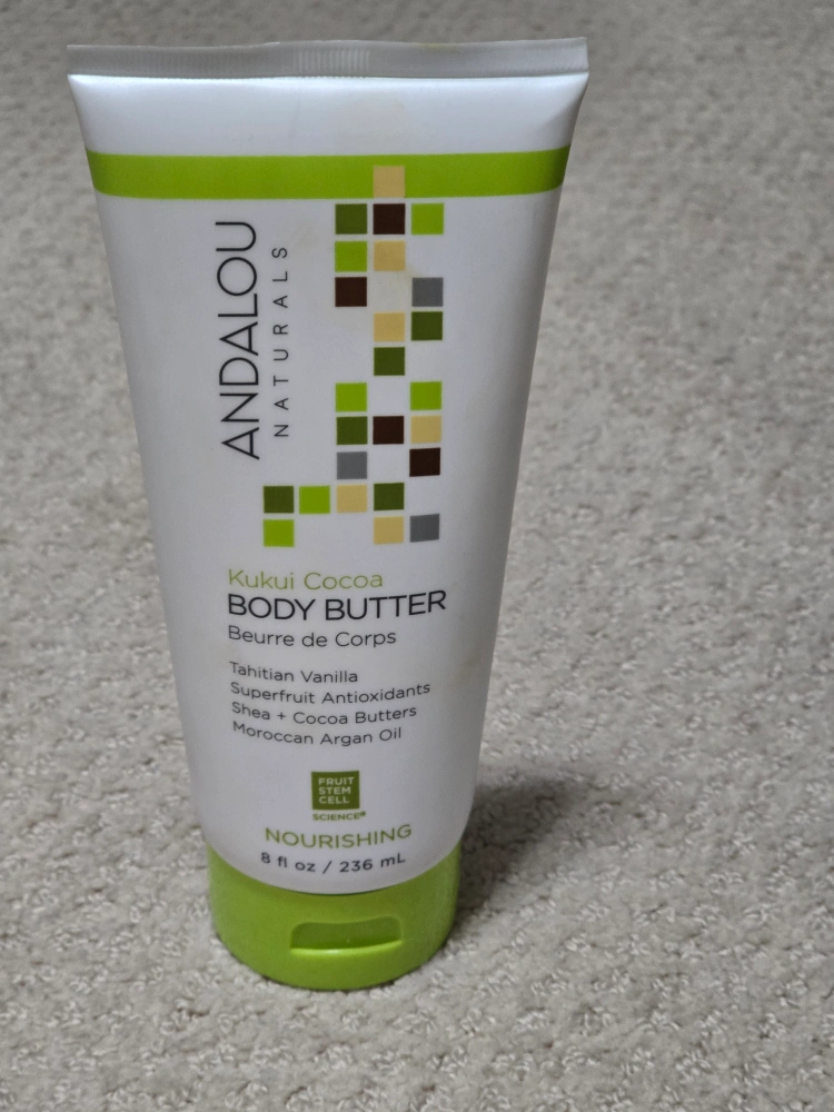 Selling a tube of Andalou Naturals Kukui Cocoa Body Butter! It's a nourishing body butter with Tahitian Vanilla, Superfruit Antioxidants, Shea + Cocoa Butters, and Moroccan Argan Oil. Contains 8 fl oz / 236mL