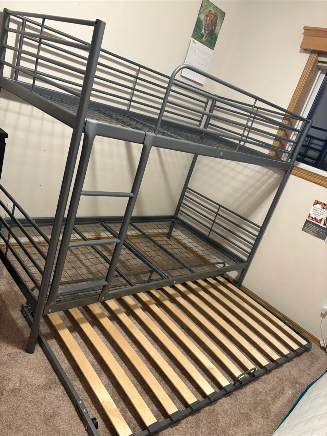 Selling an IKEA bunk bed frame that comes with a trundle bed. It is in great condition and ready for a new home. Perfect for kids' rooms!