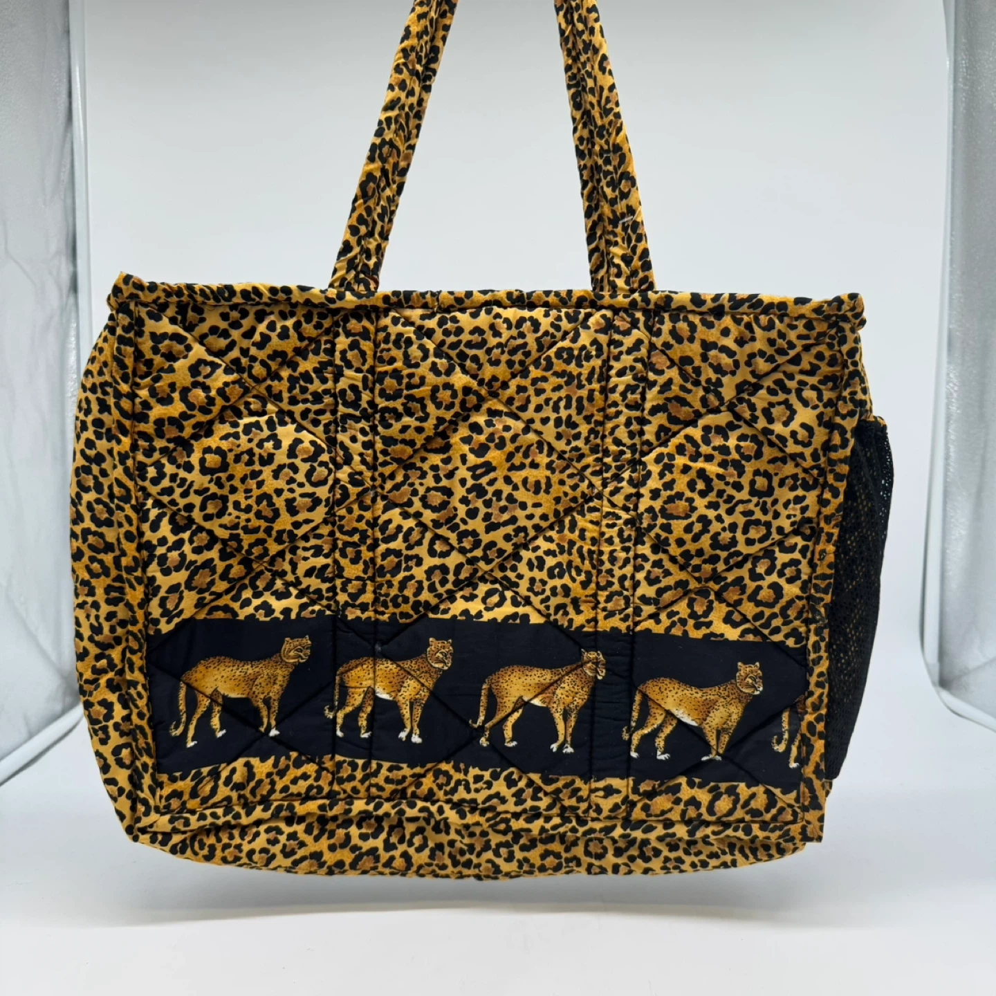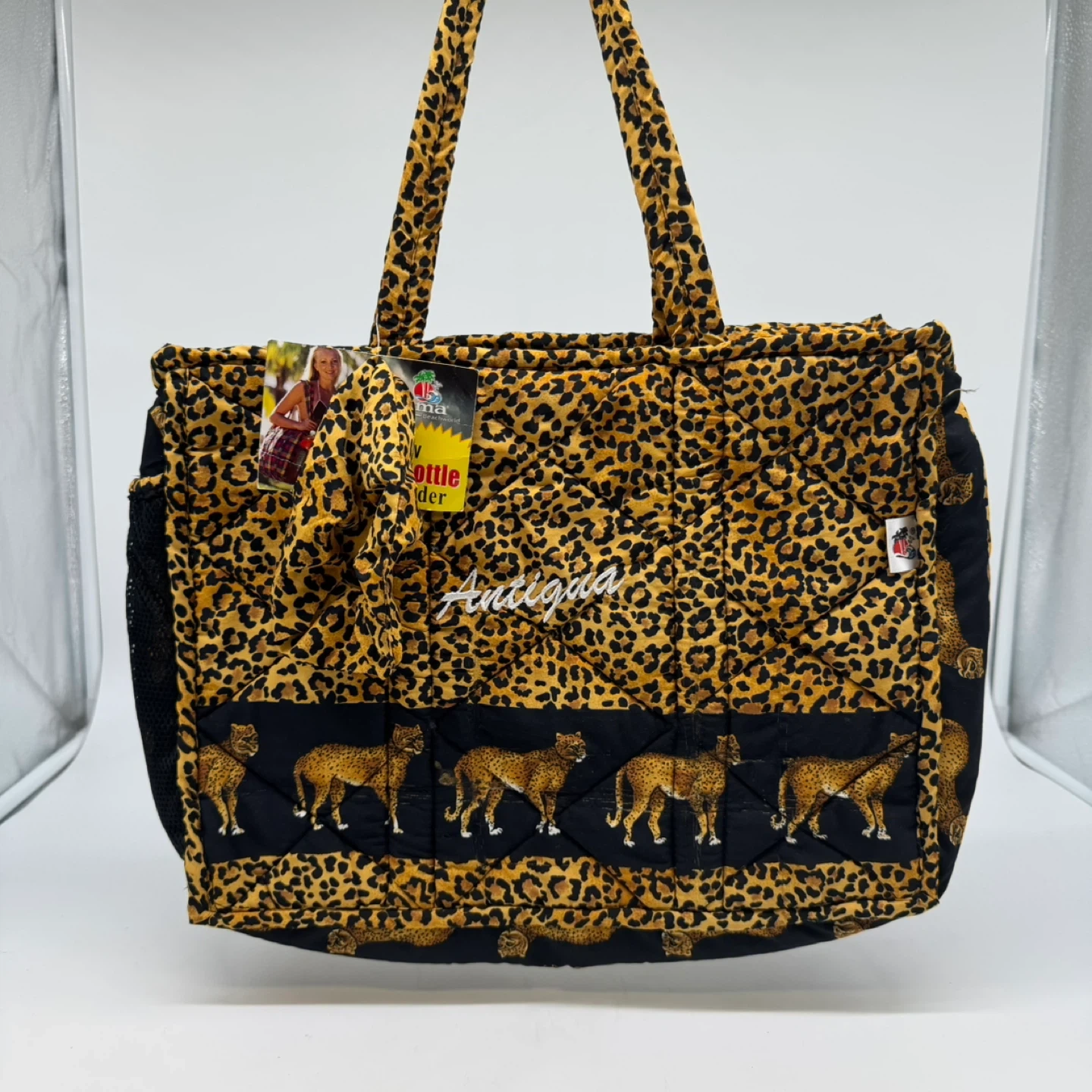 93Stand out with this bold and stylish Rima Beachworld leopard print tote bag. Features quilted fabric with cheetah accents, embroidery detail, and a bottle holder pocket on the side. Lightweight yet roomy – perfect for beach trips, shopping, or everyday use. • Size: approx. 15.5” (40 cm) wide × 12” (30 cm) tall × 5” (13 cm) deep • Material: Quilted fabric with leopard print design • Interior: Spacious main compartment with matching zippered pouch • Exterior: Side mesh pocket for bottles, embroidered “Antigua” logo • Style: Tote / Beach bag / Travel bag • Color: Yellow-black leopard print with cheetah detail ✨ Fun, practical, and eye-catching – carry your essentials in style! 📍 Pickup in North york Delivery available for extra (B2)884