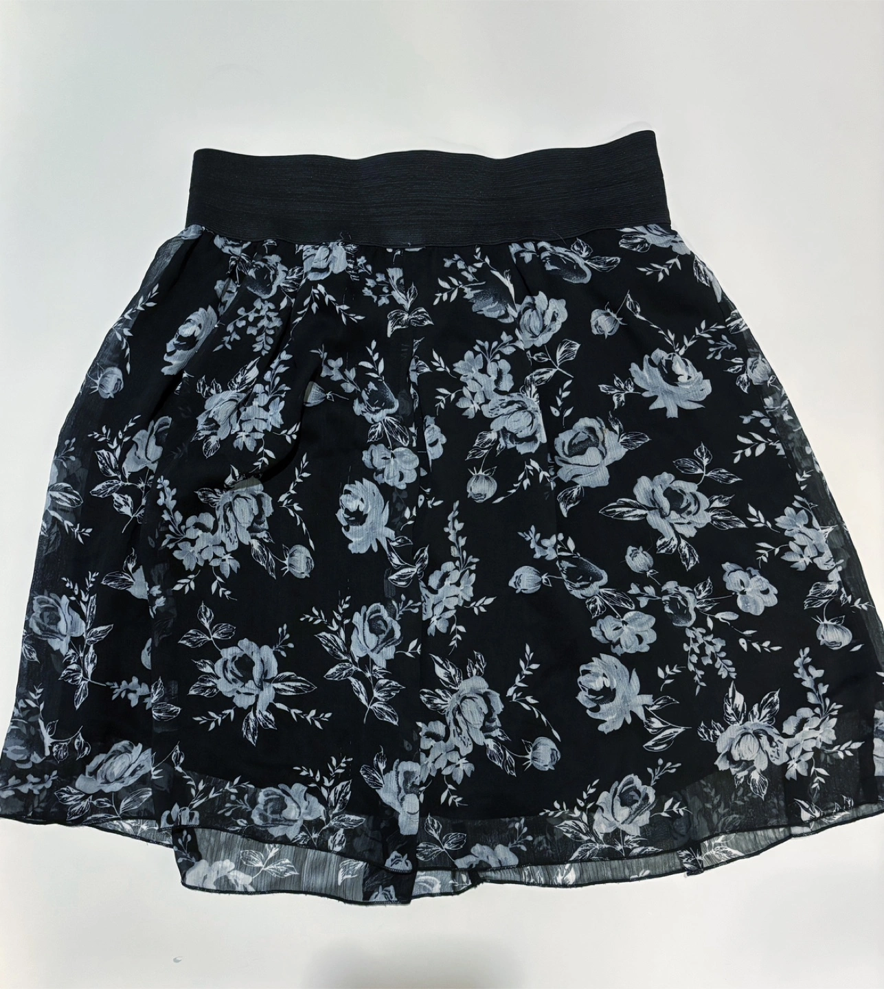 Selling a cute floral skirt in black and white! It features a comfortable elastic waistband. Perfect for adding a touch of elegance to your wardrobe. Double layered with a soft sheer overlay skirt.