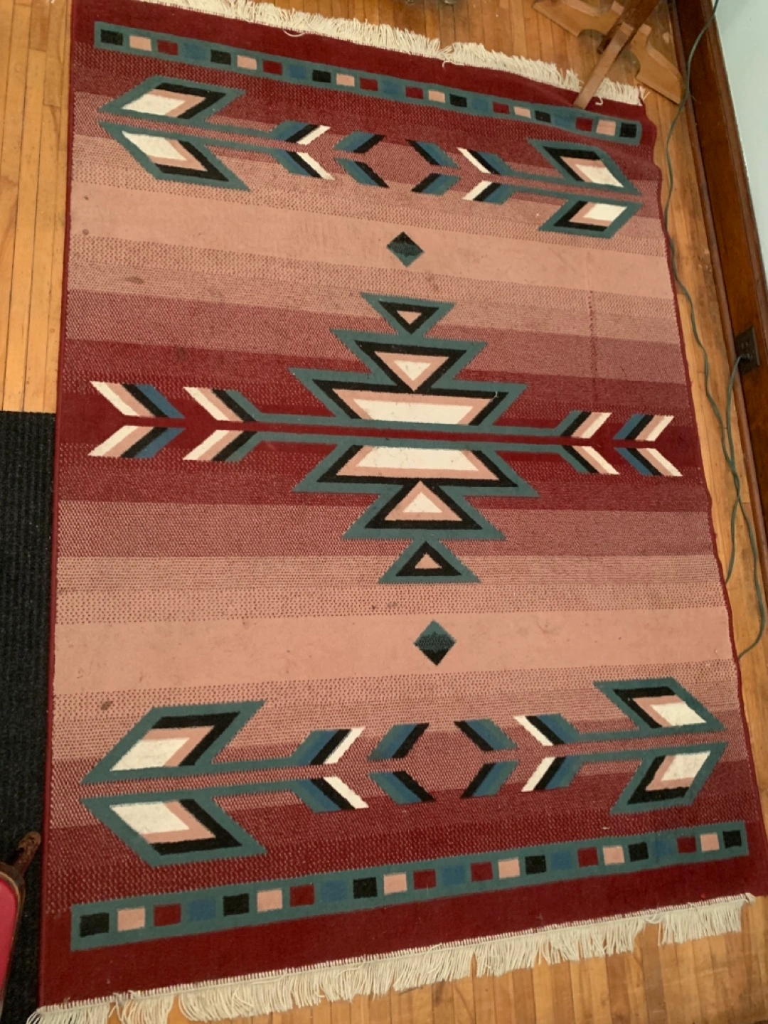 Here's a patterned area rug that could add a nice touch to your space. It features a unique design and is in good condition for a used item. Perfect for adding some character to any room in your home