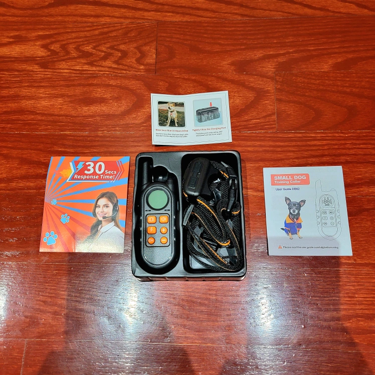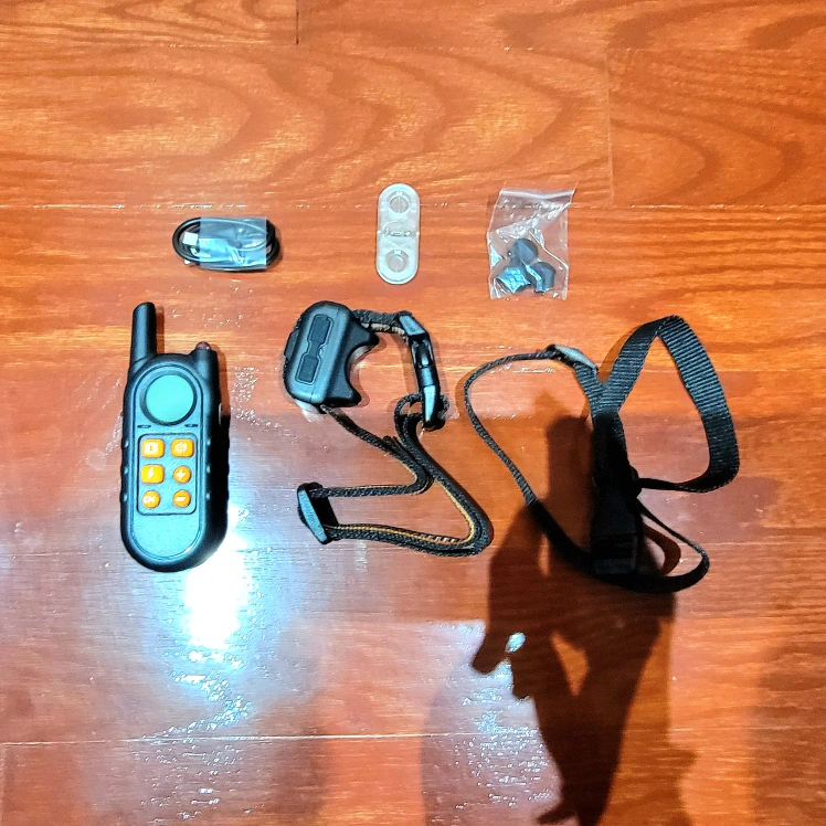 Remote controller, dog bark collar, extra collar, charging cable, and user manual