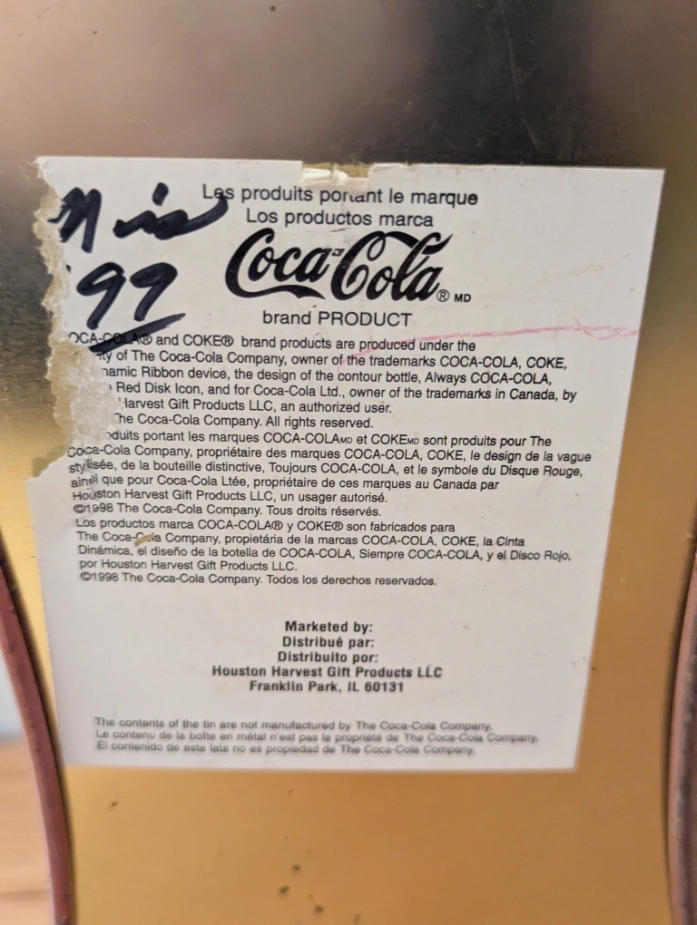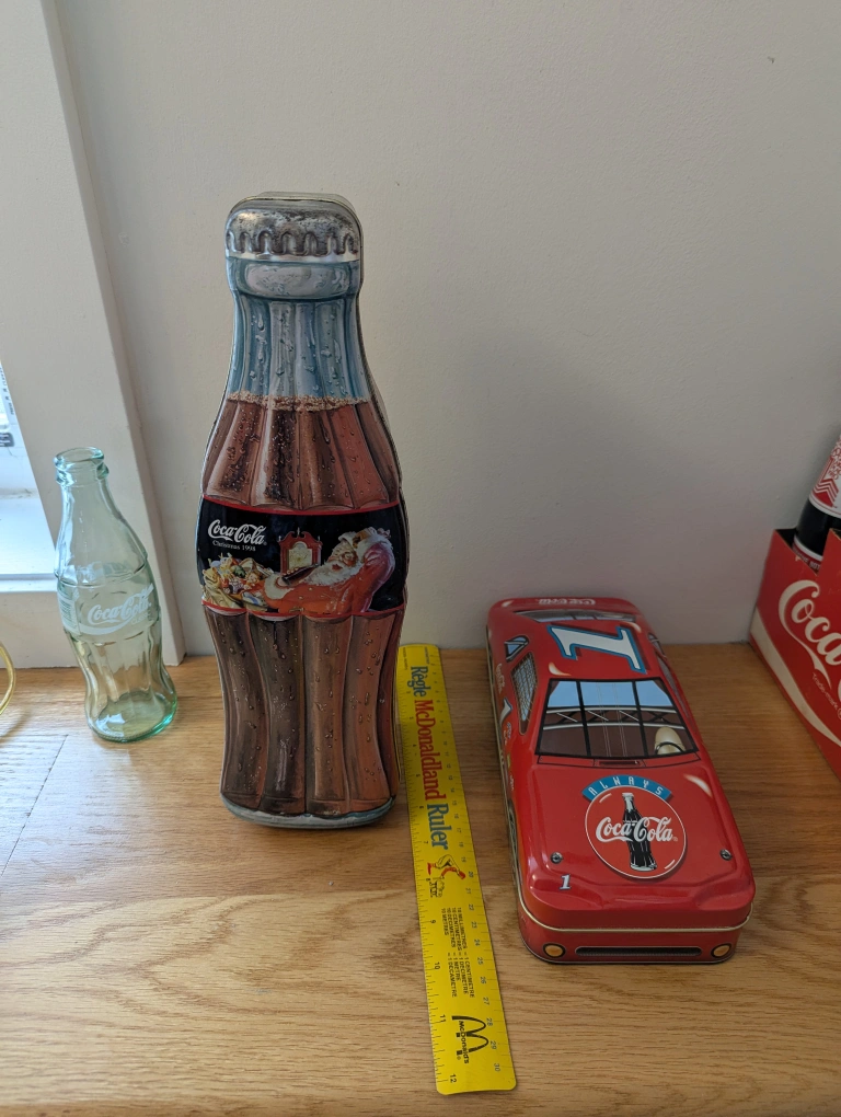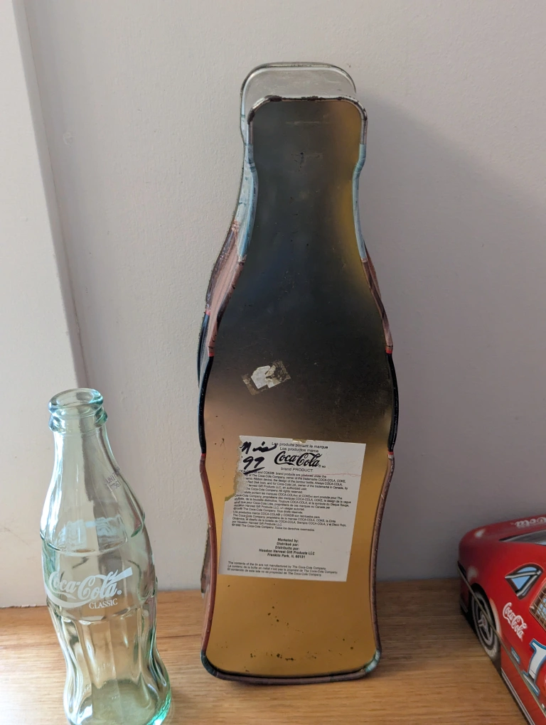 1. Is a Coca-Cola Christmas 1998 Santa tin shaped like a bottle and large enough to hold one. 13 inches tall.
