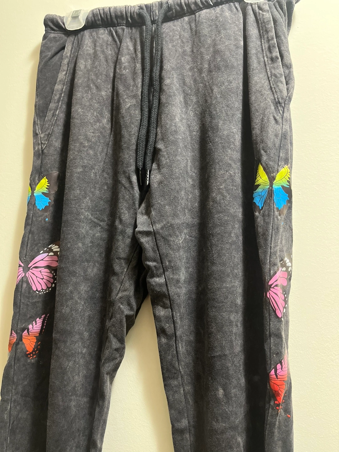 Comfy jogger pants in a dark grey wash with a butterfly print. Perfect for lounging around the house or running errands