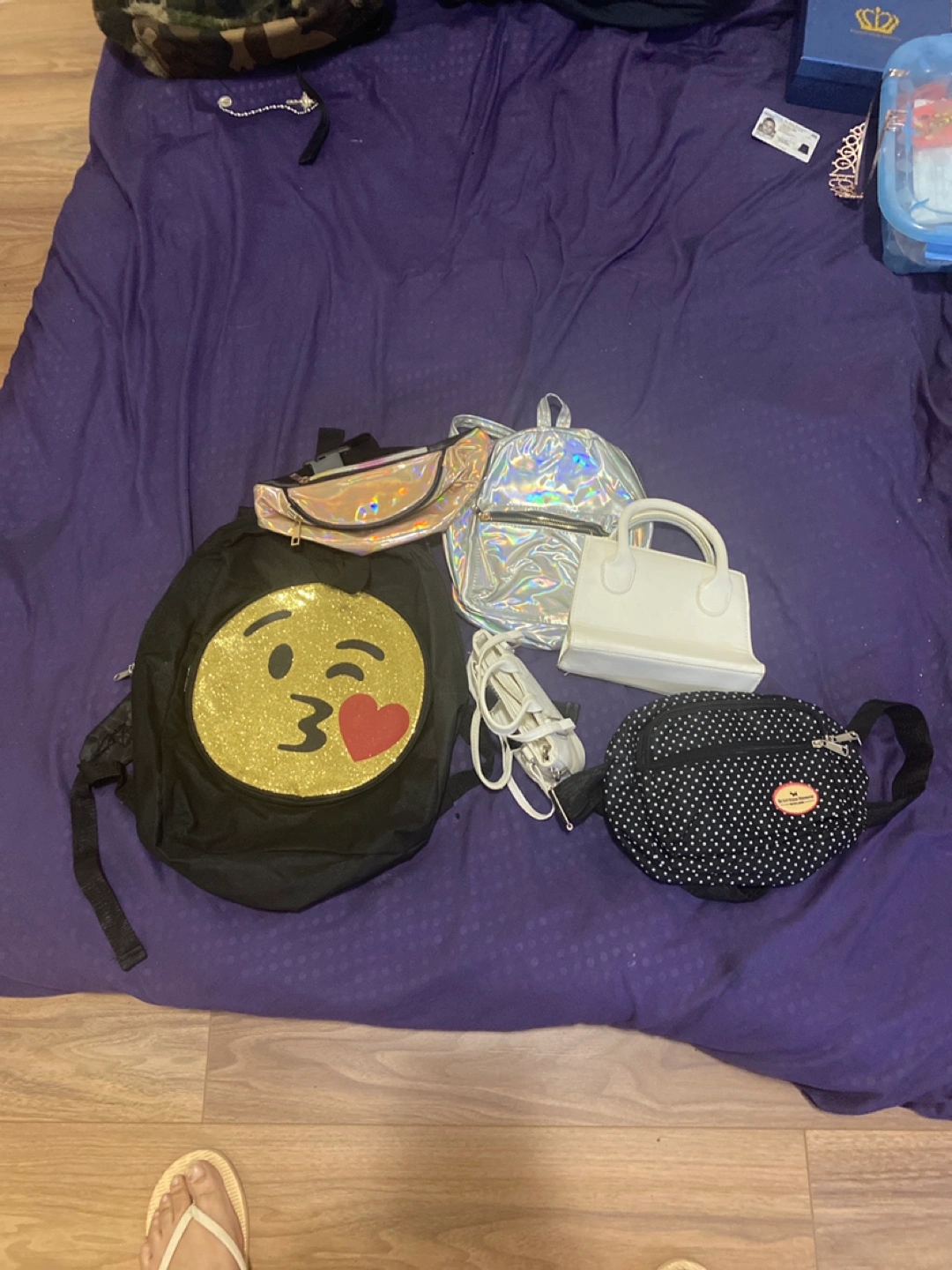 Selling a variety of bags! There's a black backpack with an emoji design, a shiny silver backpack, a white purse, a shiny fanny pack, and a black and white polka dot fanny pack