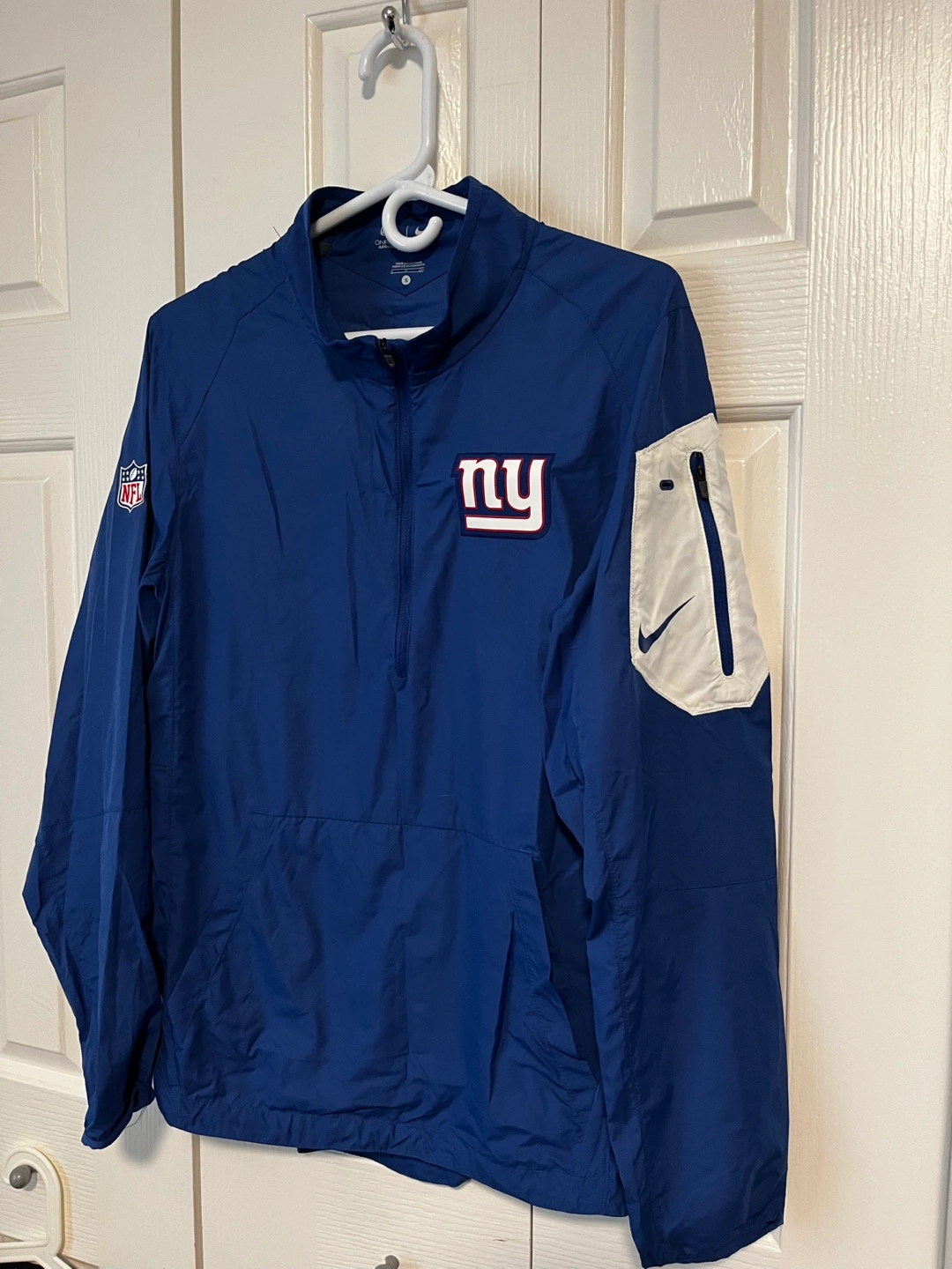 Selling a Nike NFL Giants Onfield Apparel pullover in size small. This stylish blue jacket features the Giants logo and the iconic Nike swoosh. Perfect for showing your team spirit on game day or any day!