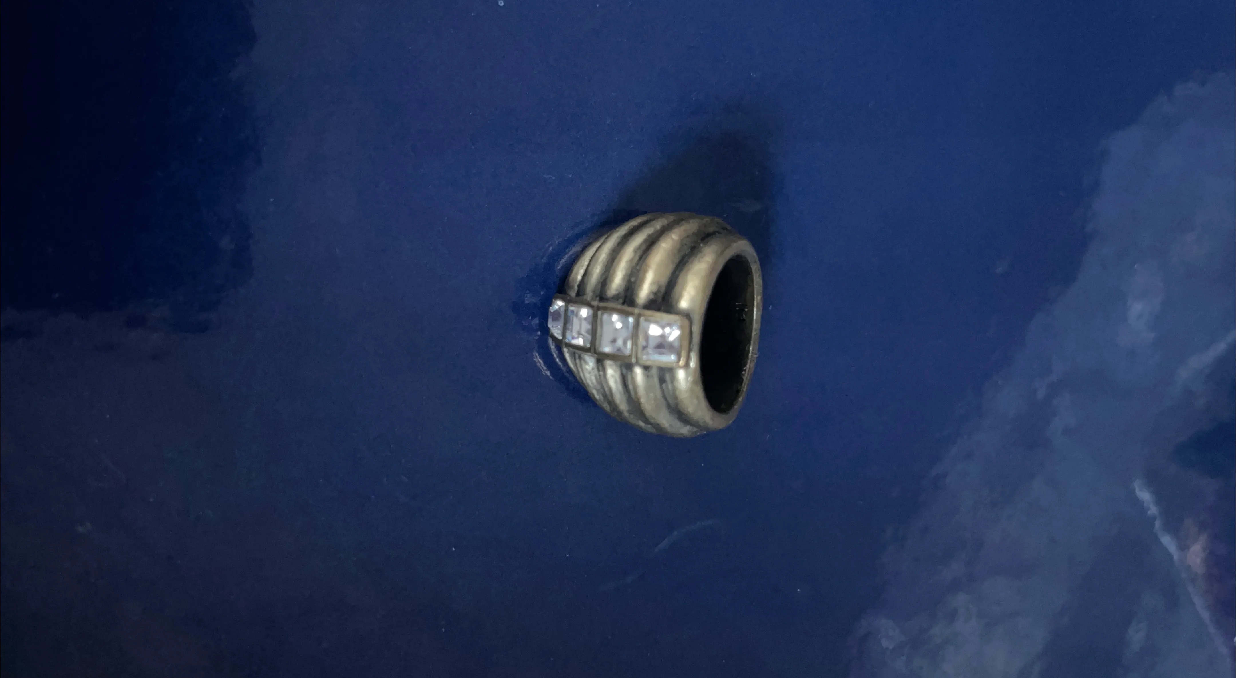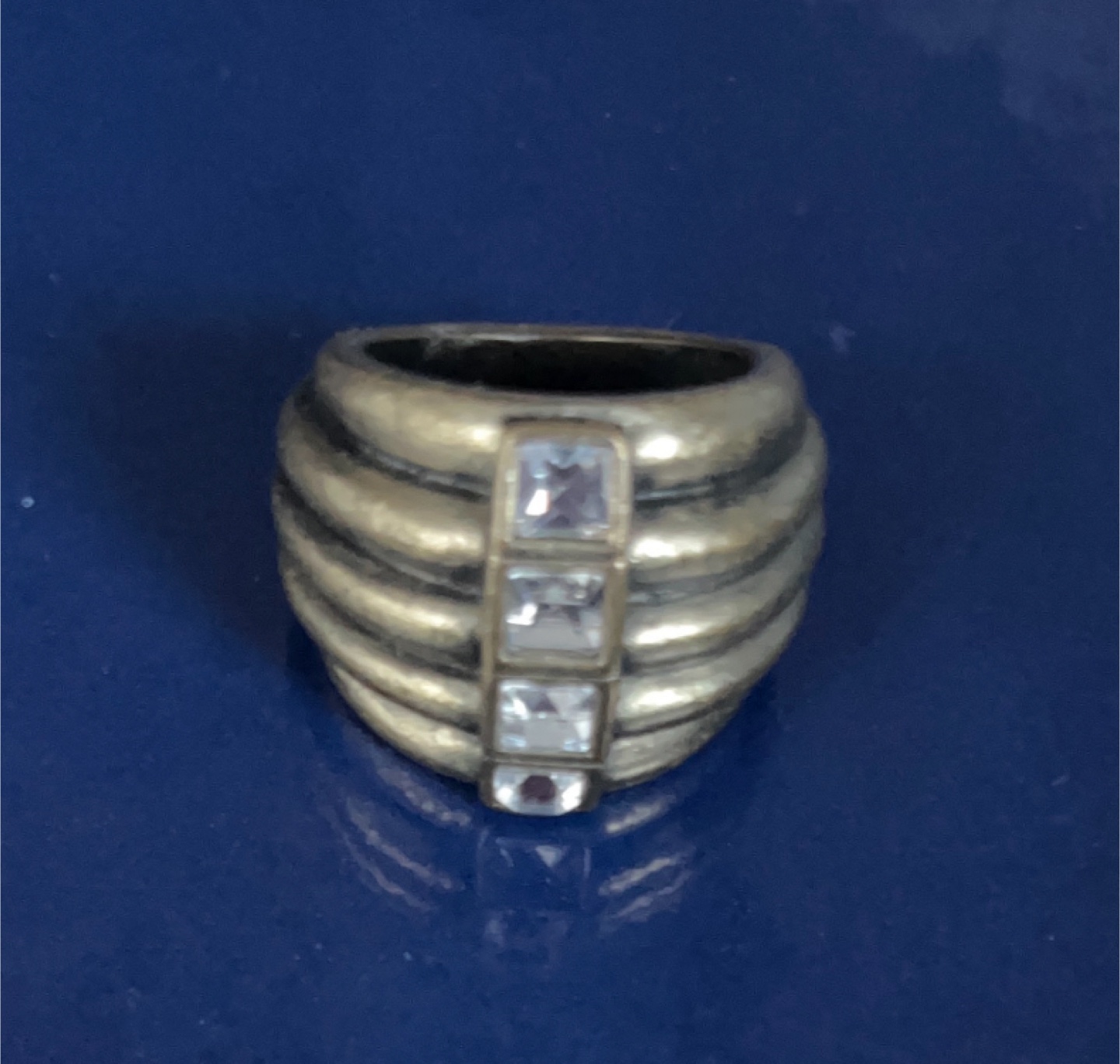 Selling a vintage-style ring with a unique design. It has a ribbed texture and three square stones set in the middle. Perfect for adding a touch of retro to your style!
