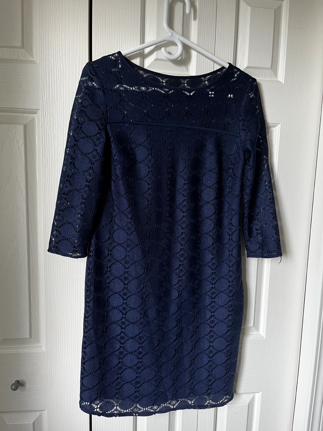 Selling a lovely navy blue lace dress from Sandra Darren! It's a size 6 and in great condition. Perfect for a night out or a special occasion. The lace detailing is really pretty!
