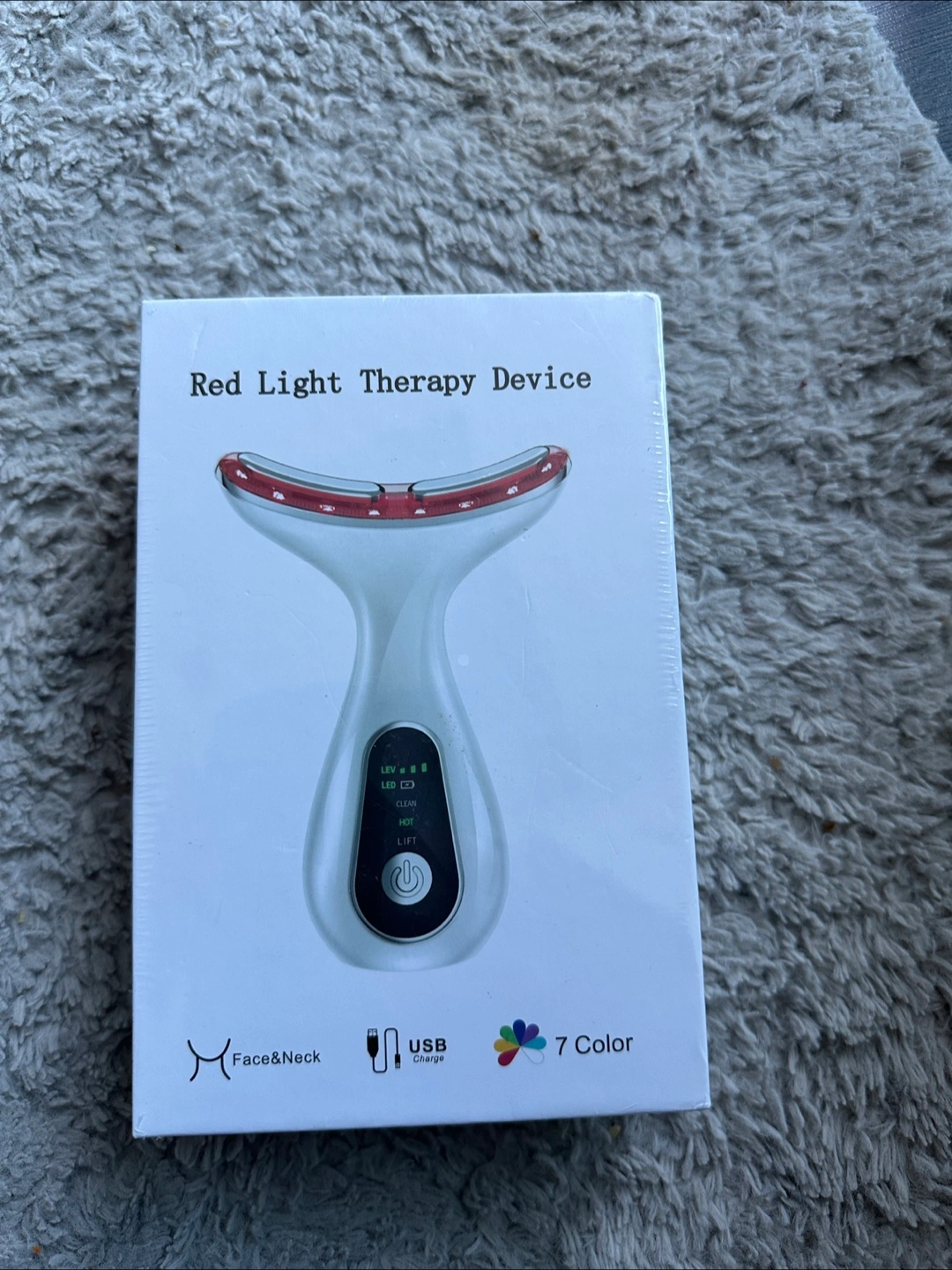 Selling a red light therapy device for face and neck! It features LED, clean, hot, and lift modes. It also comes with a USB charge cable and supports 7 different colors. Box included!