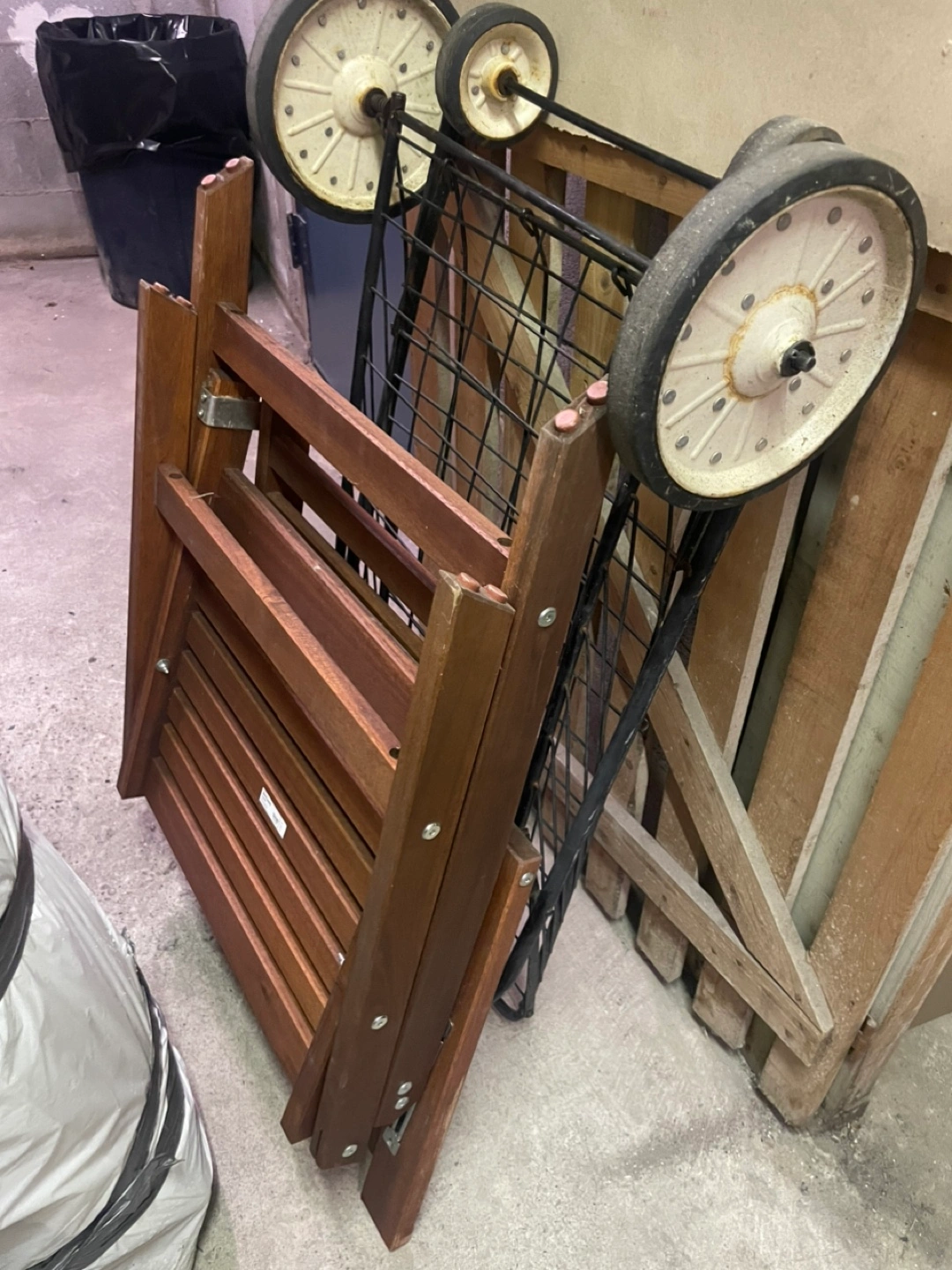 Selling a folding wooden chair and a cart with wheels. Both items are in used condition, but still have plenty of life left. Perfect for extra seating or hauling items around the yard or home