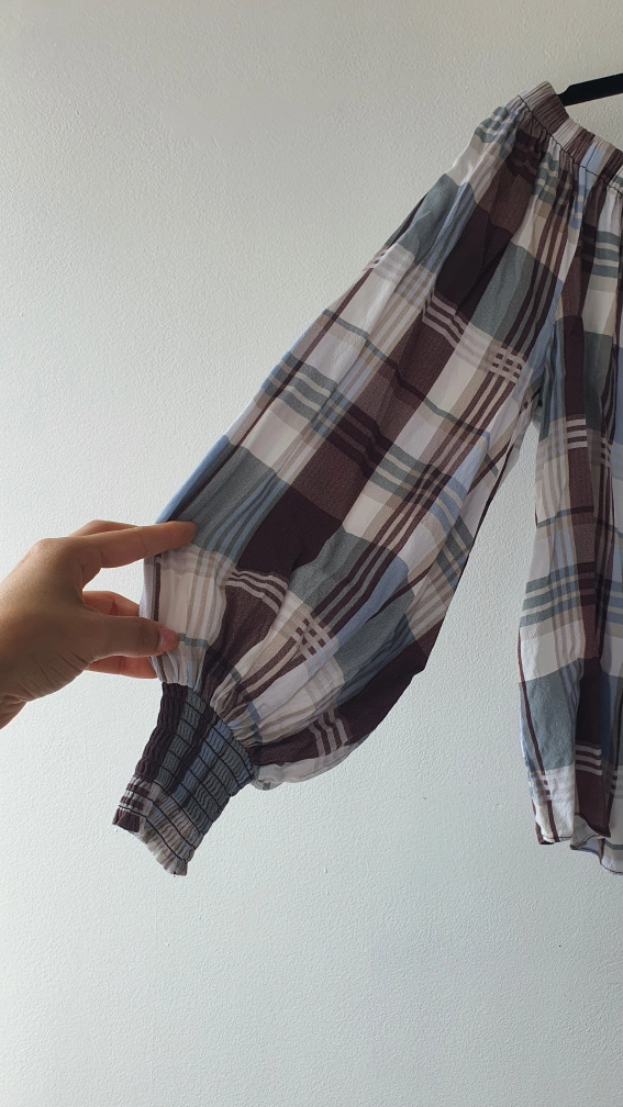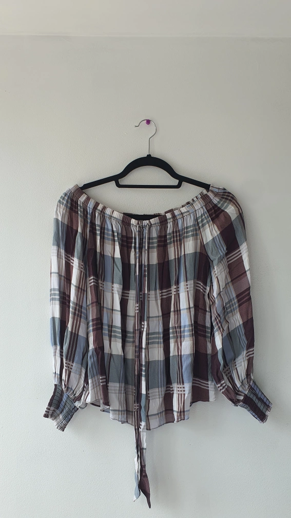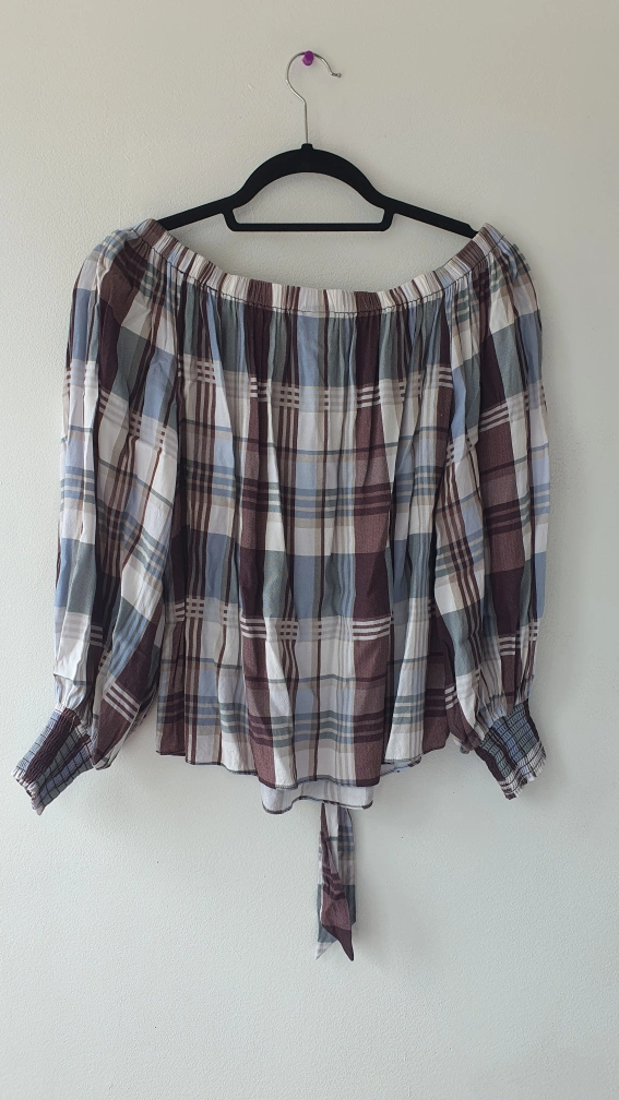 Selling a cute set including an off-shoulder plaid blouse and patterned pants! The blouse has a tie at the front and elasticated cuffs. The pants have an elastic waistband for a comfy fit. Both items are in great condition and ready for a new home. very light and comfortable for summer