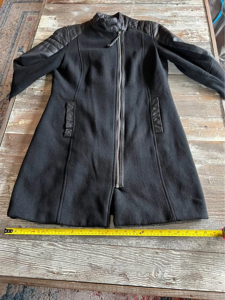 Stylish Scandinavian design by Ellos. This chic black long coat combines a wool-blend body with sleek faux leather sleeves and trim, giving it a modern moto-inspired look. Perfect for adding an edgy yet classic touch to your winter or fall wardrobe! Excellent condition, Well kept, no major flaws to note.
