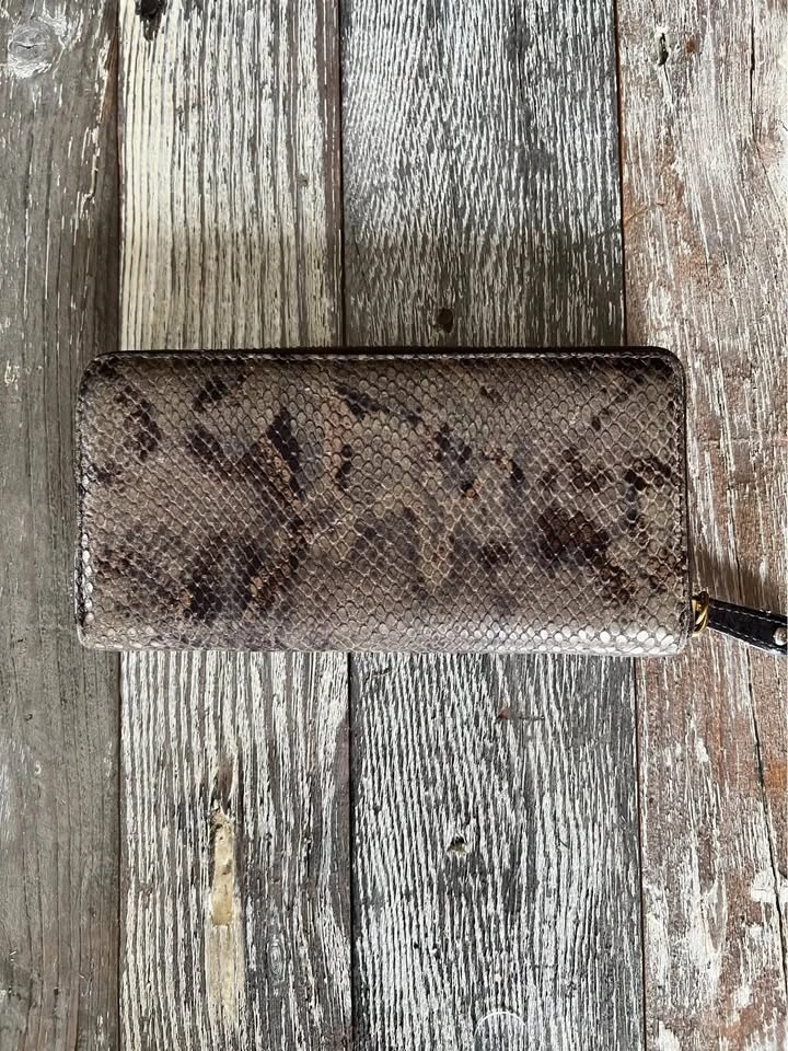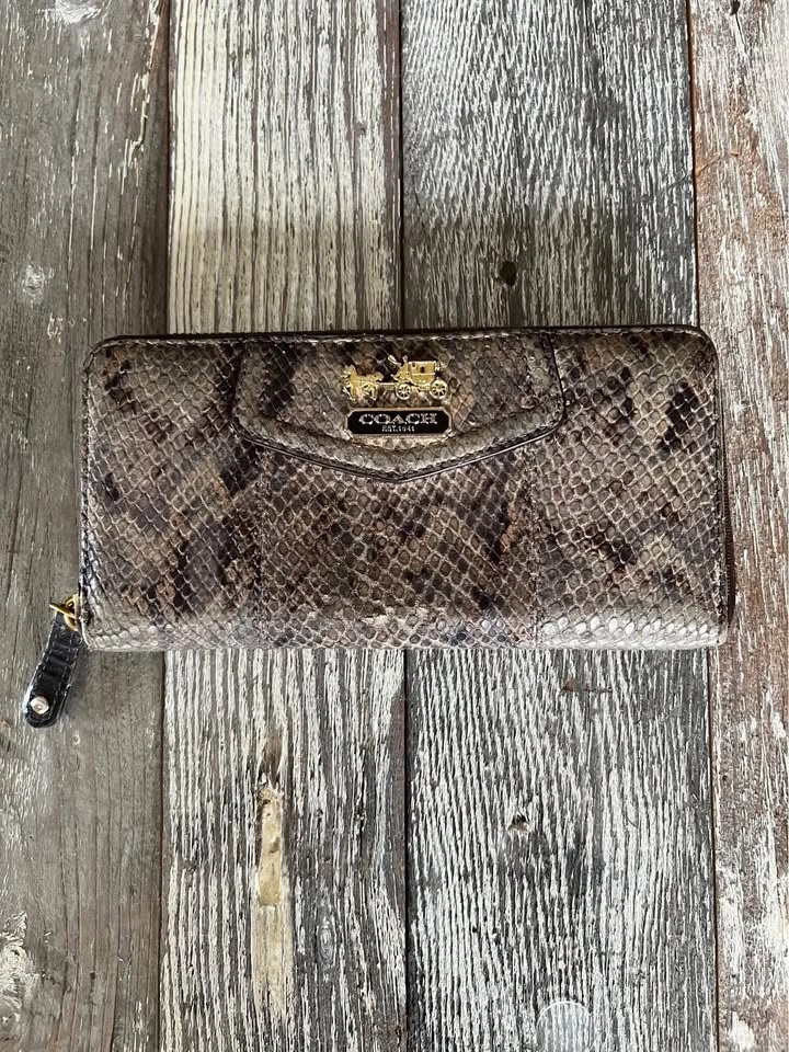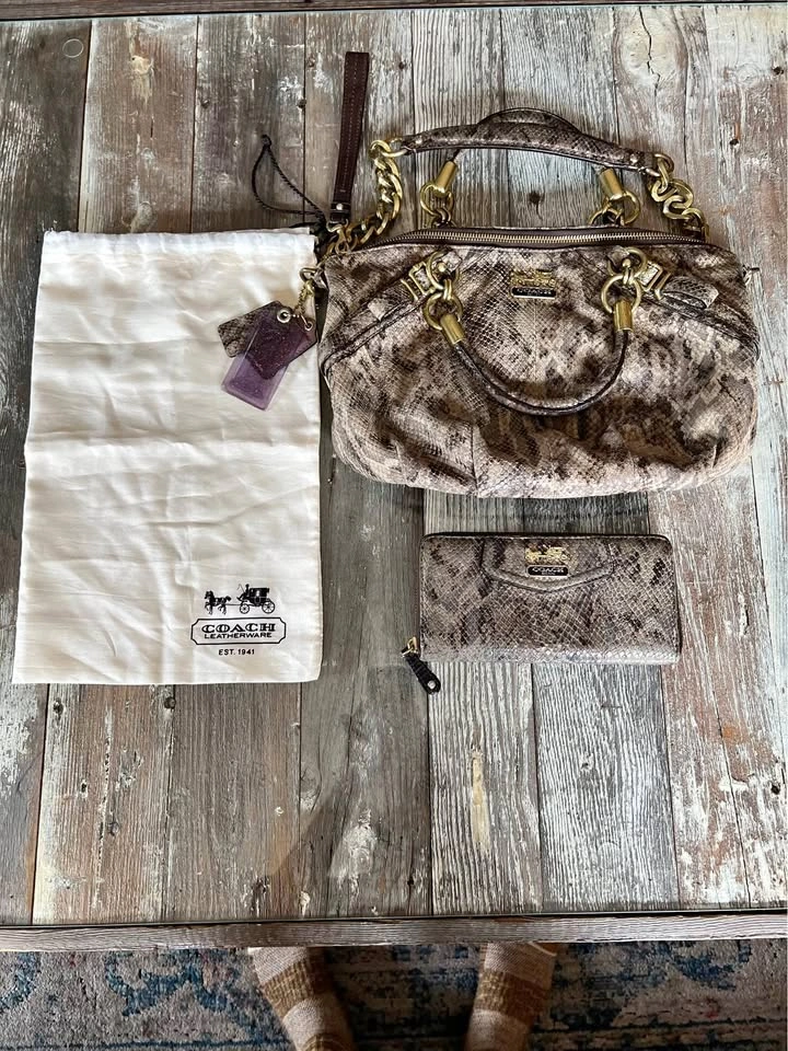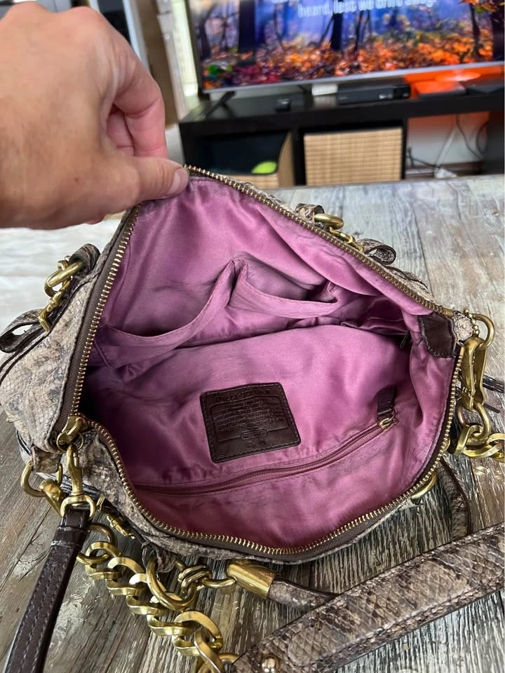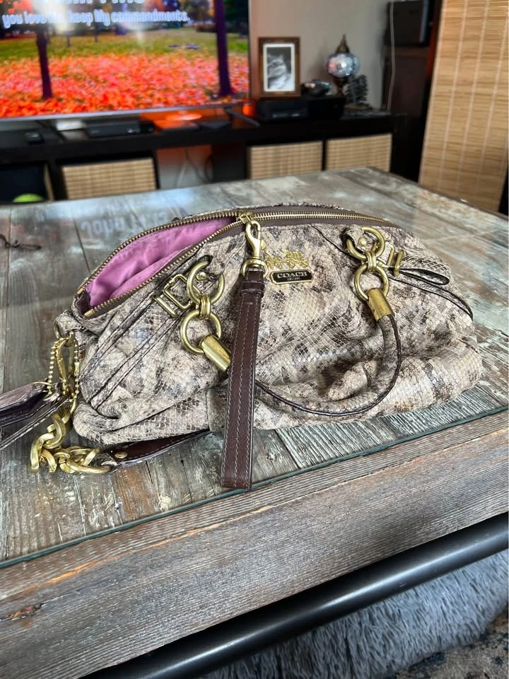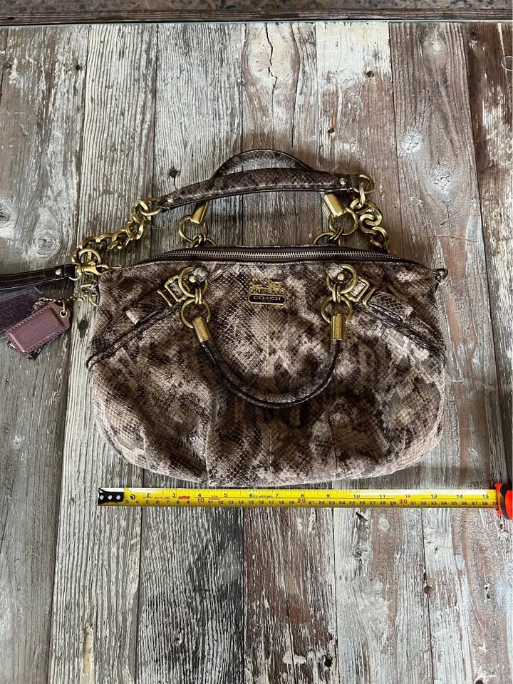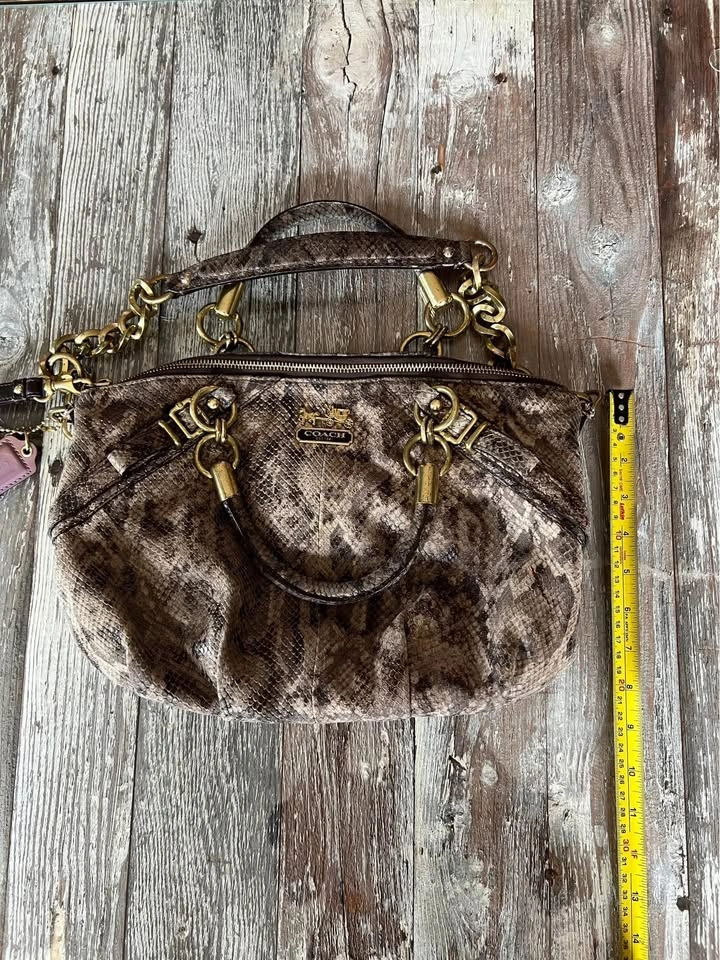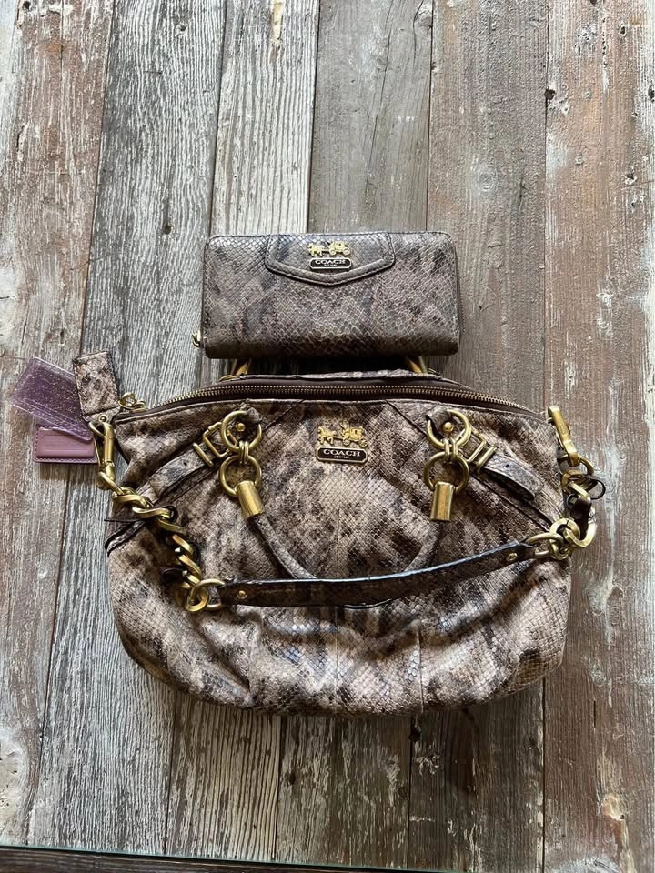 Coach Satchel/ Hand bag. Size medium. Colour Brown/Black. Interior color, pink. Madison Sophia Satchel (python embossed leather. Double handles with chunky gold chain + leather strap. Zip-top closure. Coach horse & carriage logo plates and badges. Spacious interior with pockets and one zip pocket. Wallet features: Matching python embossed leather. Zip closure. Multiple card slots, ID window, bill compartments. Coach logo plate. With original dust bag. Condition is Good, signs of use some miner flaws but good all around see pictures for detailed examination. Vintage Rare