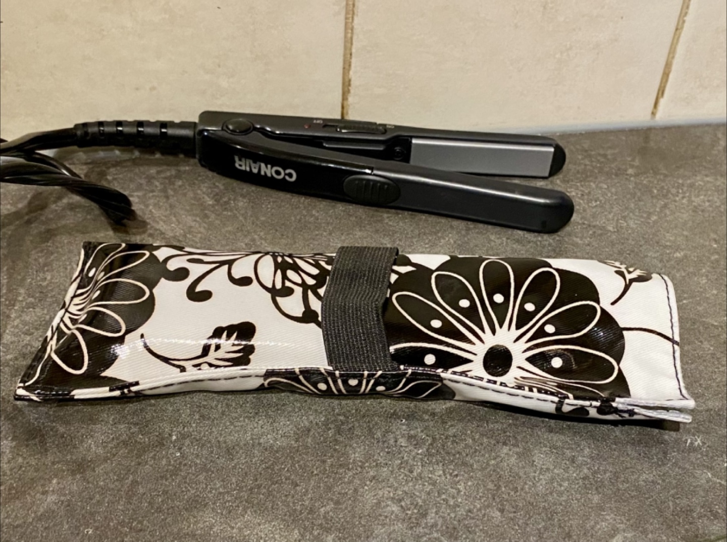 Selling a Conair hair straightener. It comes with a cute black and white patterned case for easy storage and travel. Perfect for quick styling on the go
