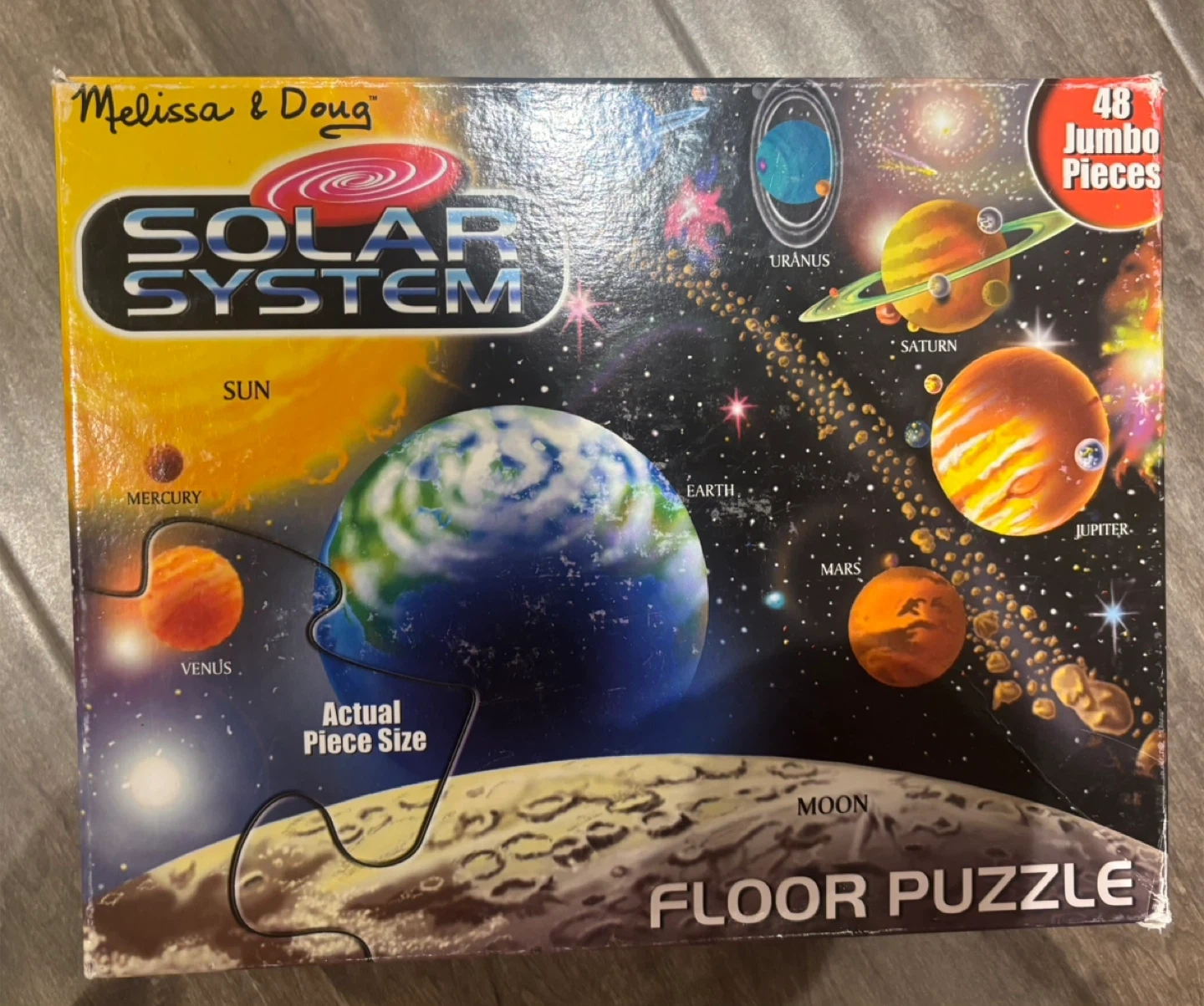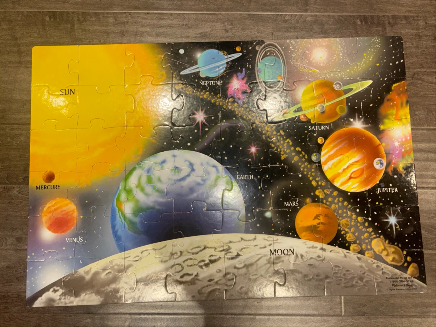 I'm selling a Melissa & Doug Solar System Floor Puzzle. It has 48 jumbo pieces and features planets like Earth, Mars, and Saturn. Perfect for learning about the solar system!