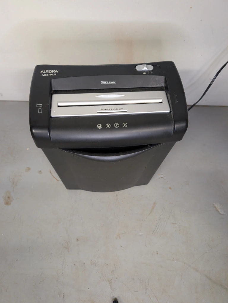Selling an Aurora AS870CR paper shredder. It can shred up to 8 sheets of paper at a time, and can also shred credit cards. Great for home or office use!
