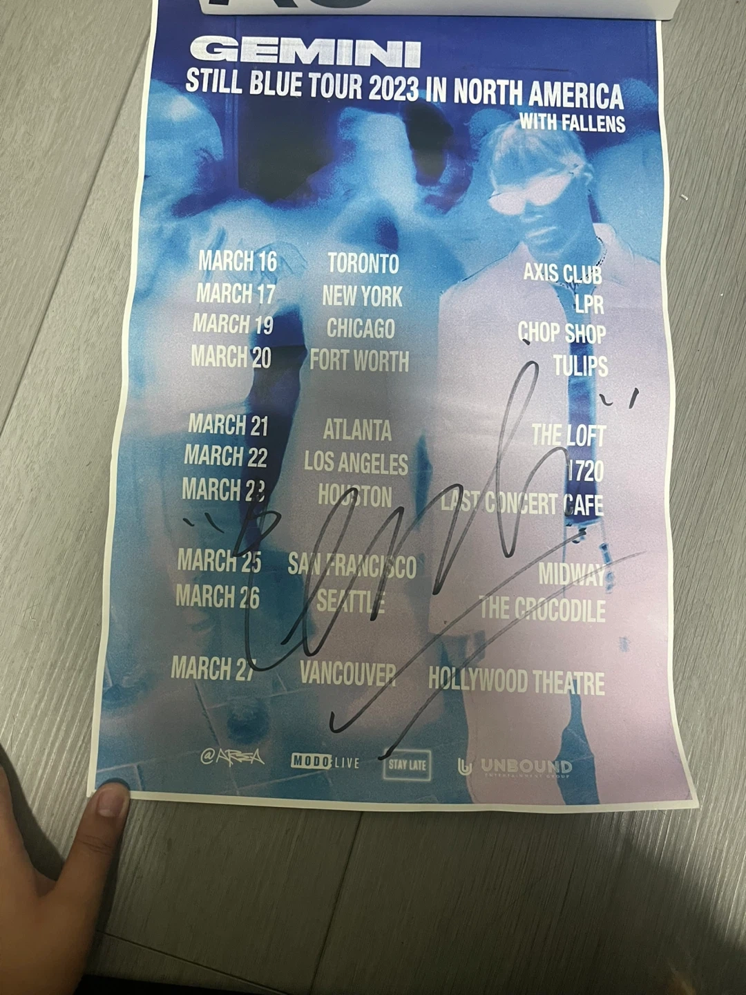 74SIGNED gemini poster from still blue tour 2023. It’s a little wrinkly but its still in good condition.