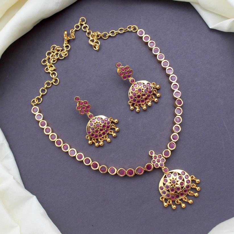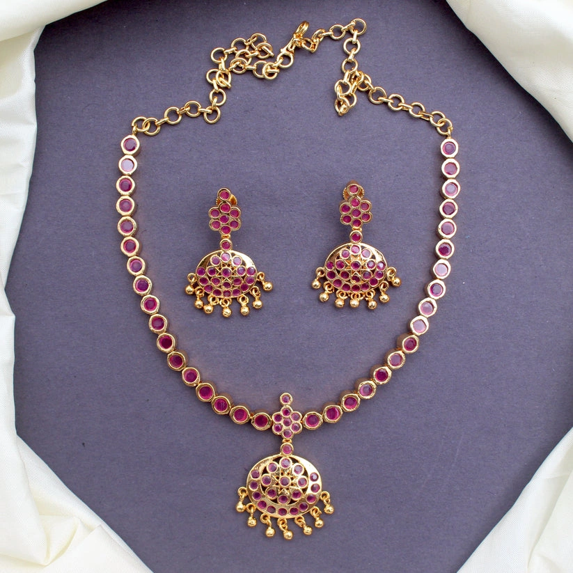 A beautiful gold-plated necklace and earring set! The necklace features a delicate chain with ruby-coloured stones, and the earrings are a matching jhumka style. Perfect for adding a touch of elegance to any outfit
