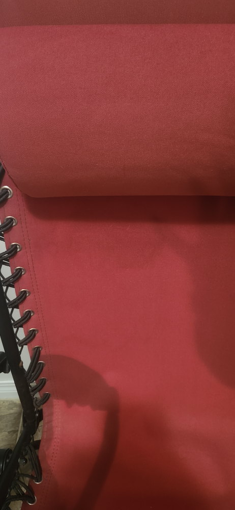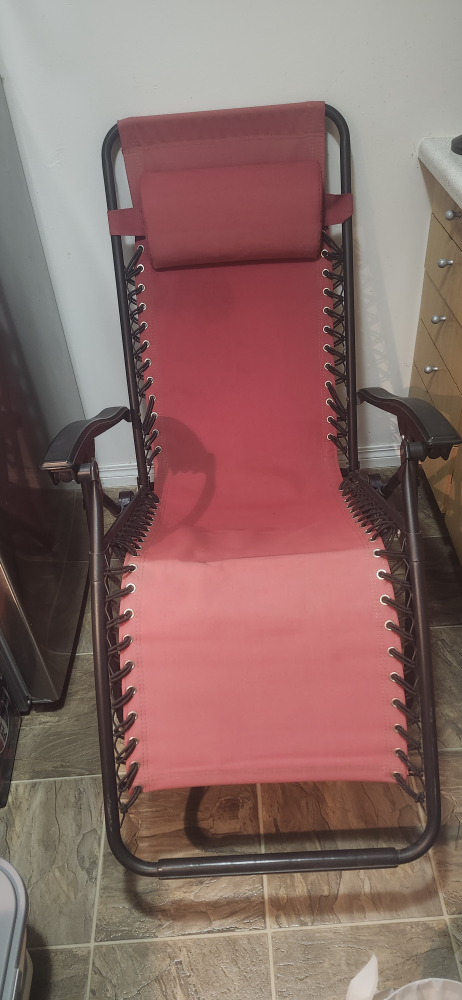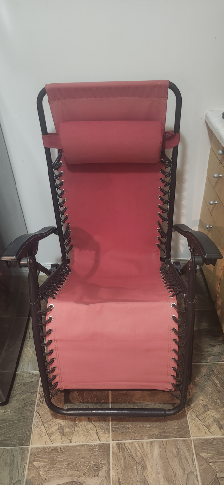 Selling a comfy red zero gravity lounge chair! This chair is perfect for relaxing outdoors or indoors. It's in great condition and ready for a new home. Please note, it only has a darker roundish spot of red close to the headrest, as pictured. I am not sure why that is the case, because nothing was spilled on it. Still in great condition, only used about 5 times.