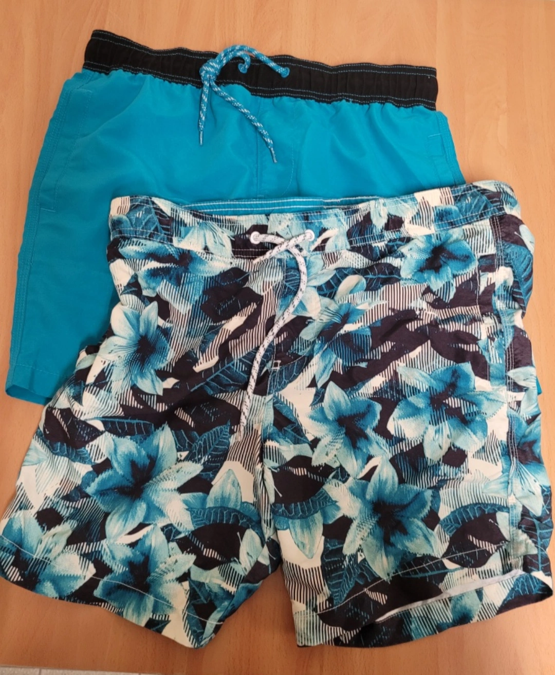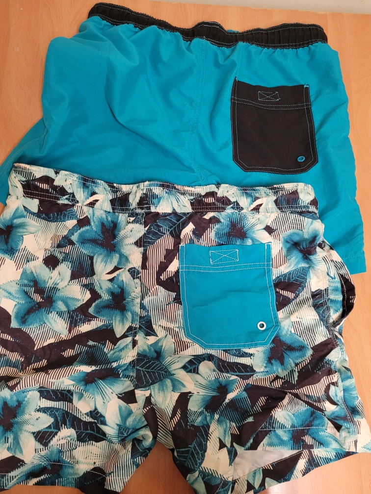 Two pairs of Aeropostale swim trunks, both size small! One pair is solid turquoise, and the other has a blue and white floral pattern. Both have 2 side pockets and 1 single pocket im the back. Both are in great shape and ready for the pool or beach.