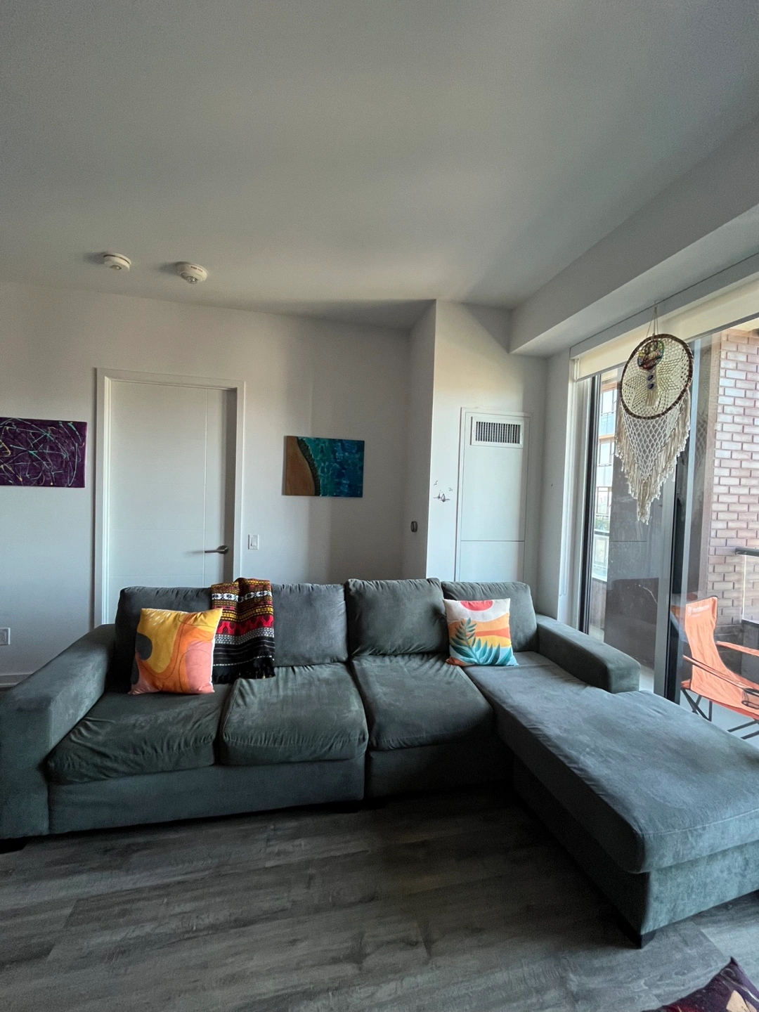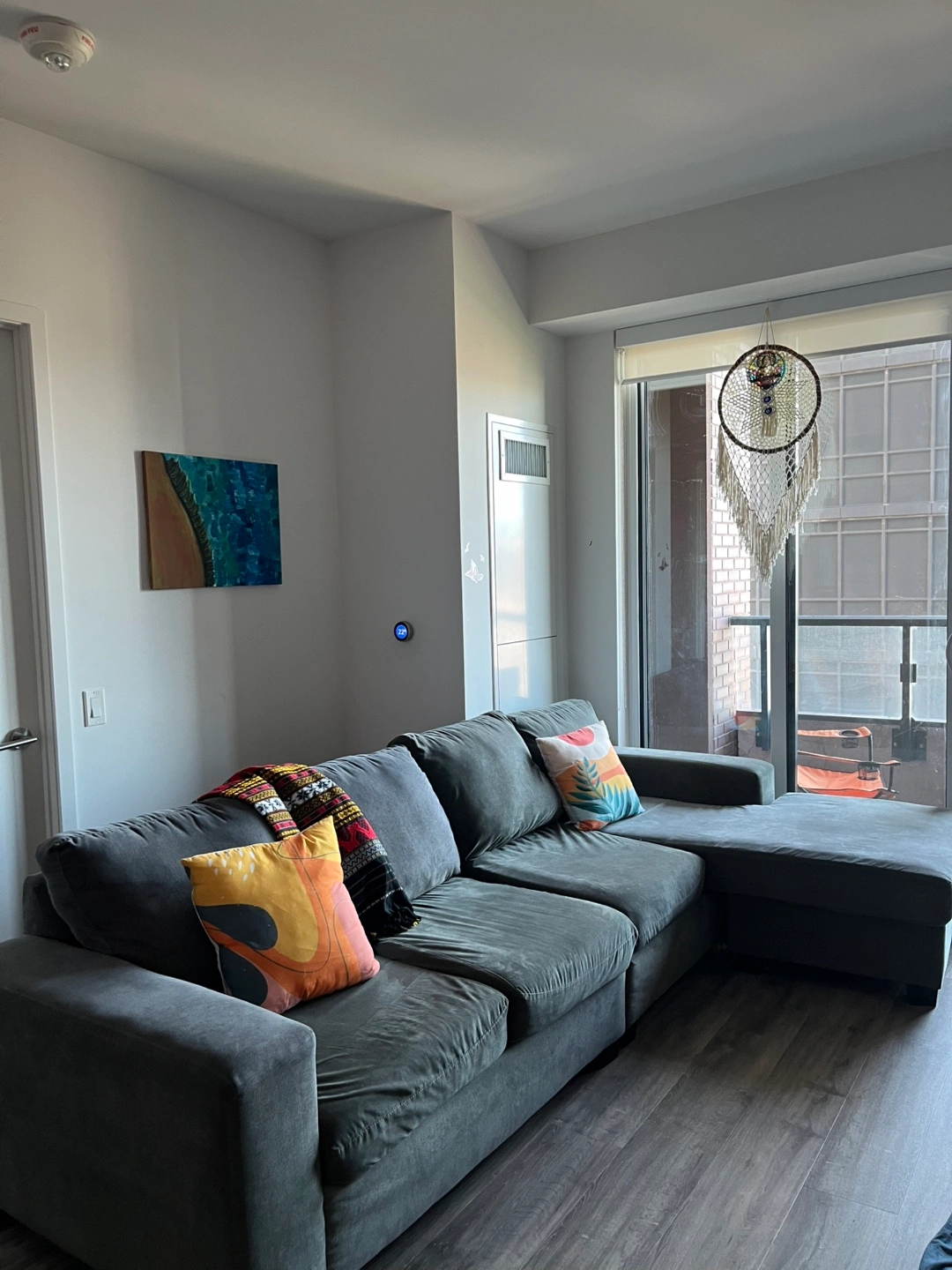 Selling a comfy grey sectional sofa! It features a chaise lounge for extra relaxation. The sofa is in good condition and ready for a new home. Perfect for a living room or entertainment space!