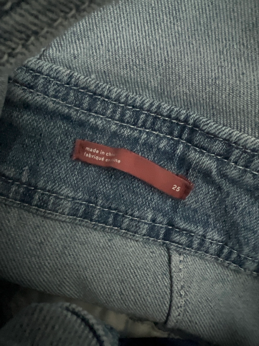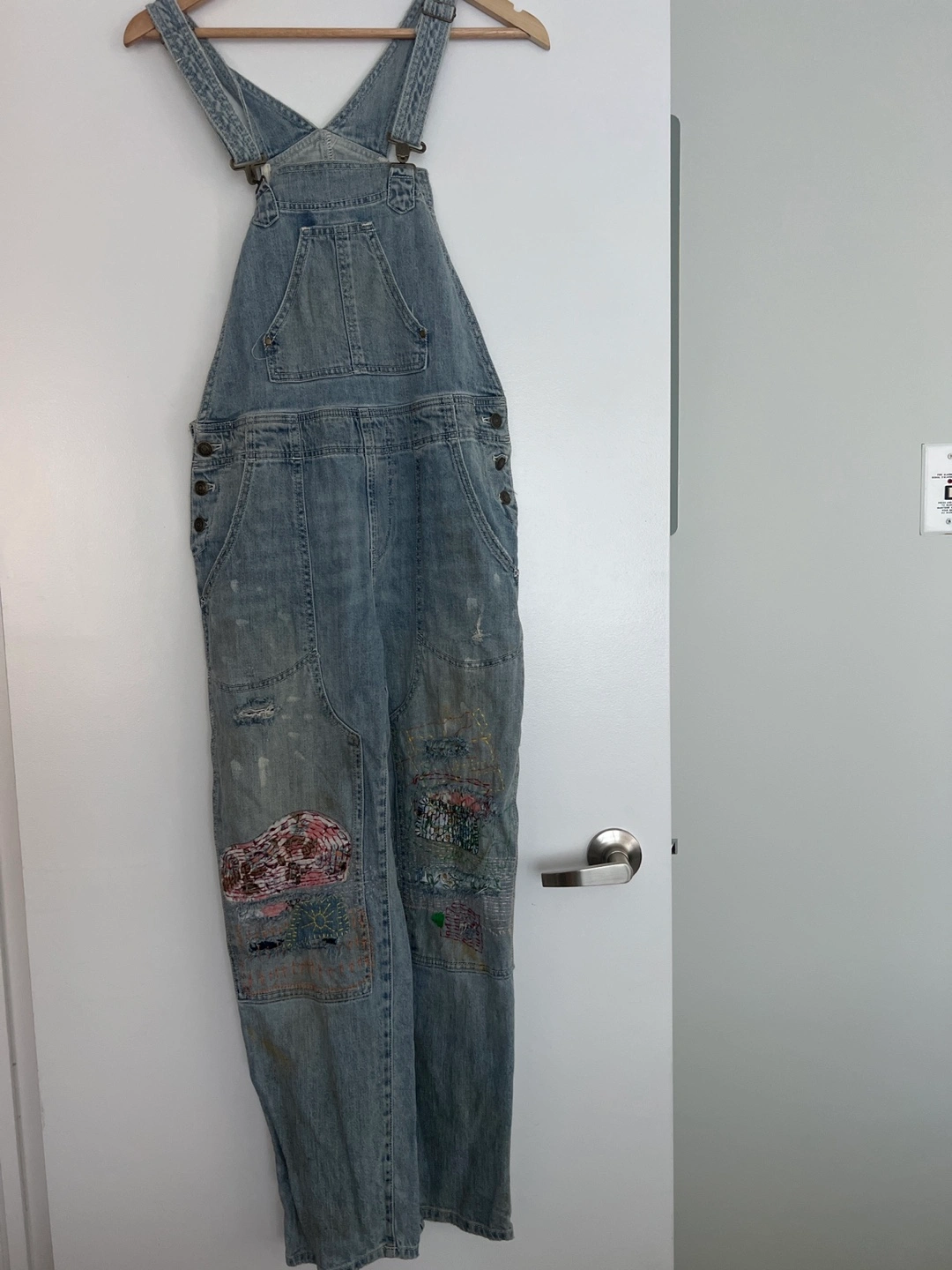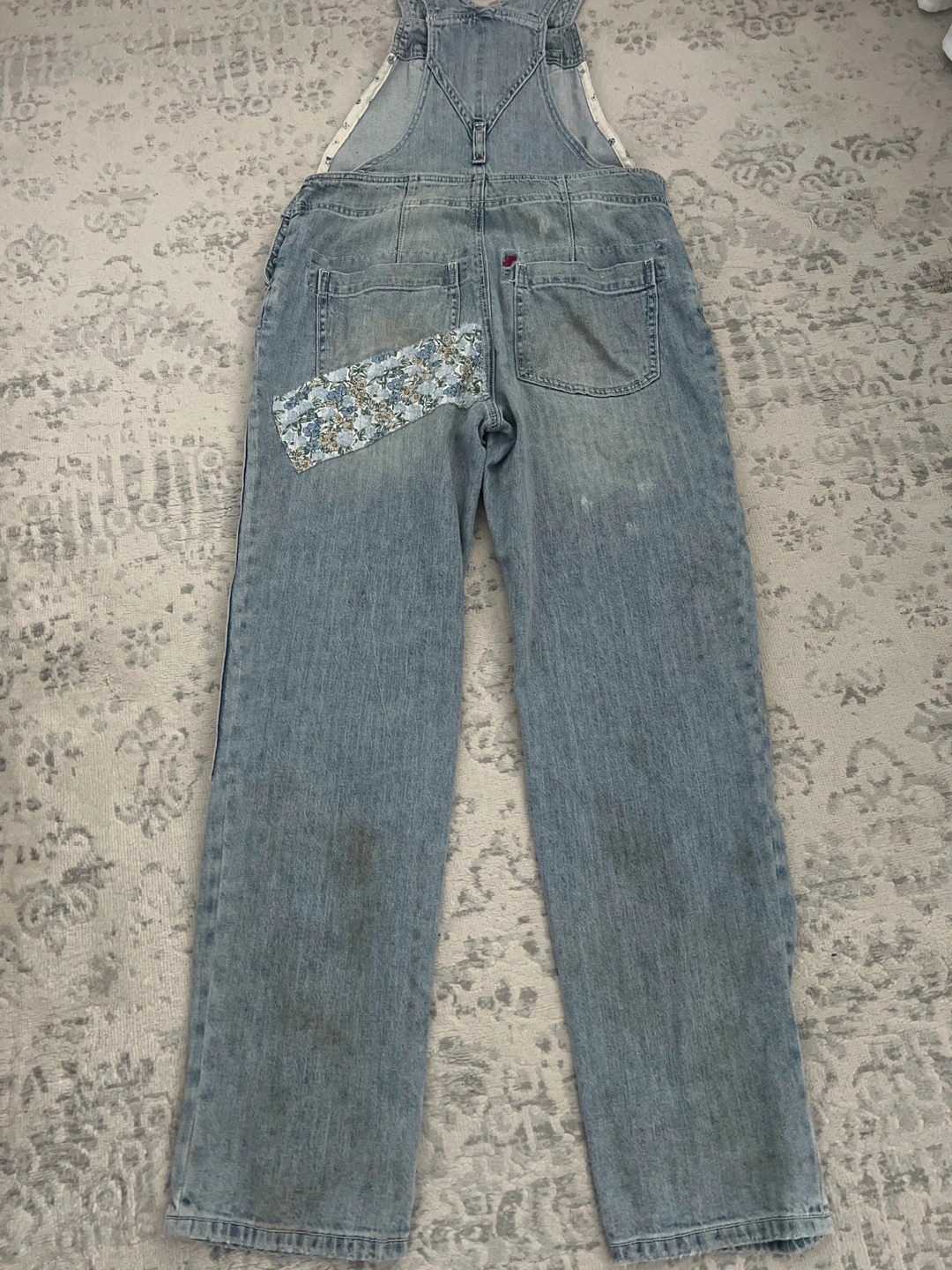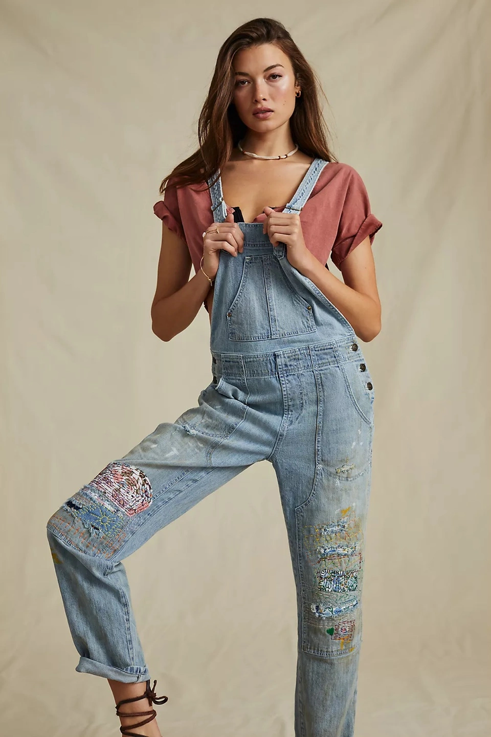 These denim overalls have a unique, distressed look with patchwork details. They're perfect for a casual, stylish outfit. The light wash denim gives them a vintage feel.
