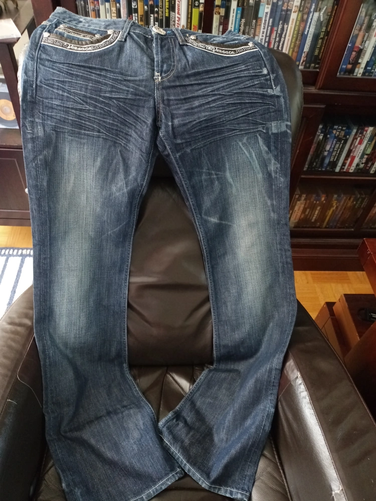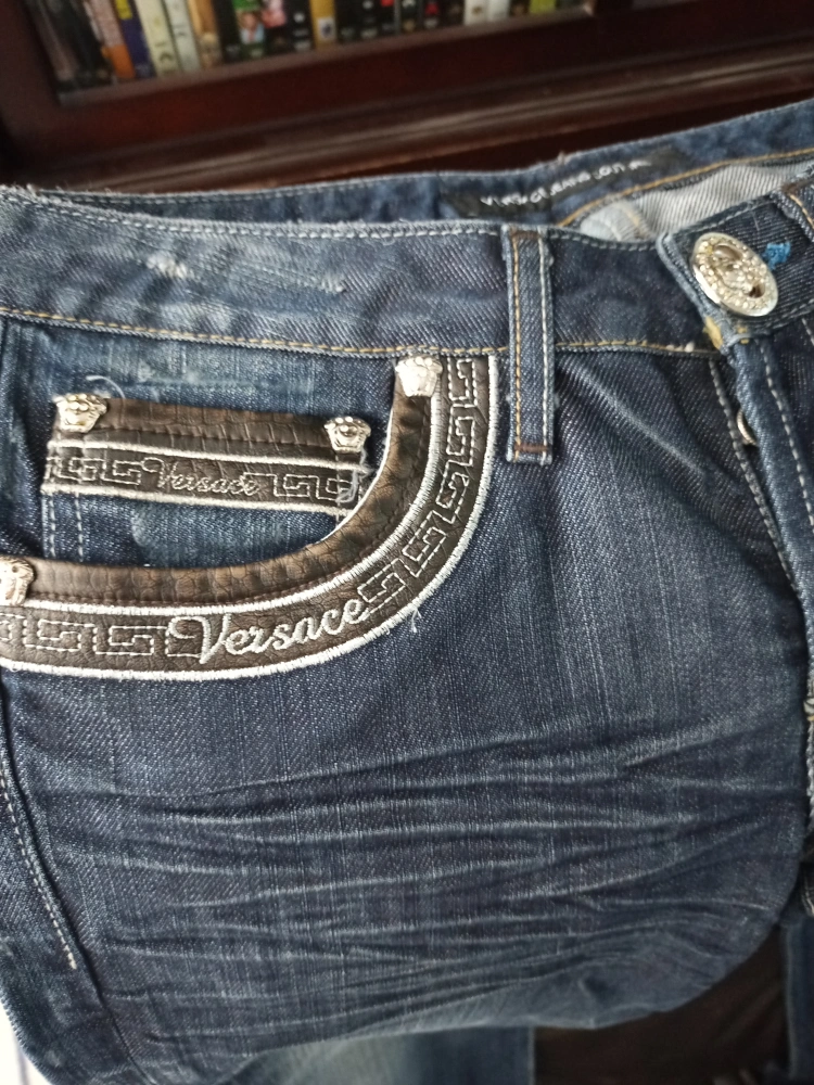 Here are some Versace jeans. They are blue and have the Versace logo on the pocket and waist. Perfect for anyone who loves high-end fashion!