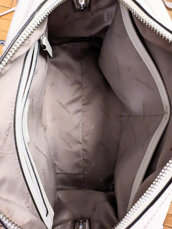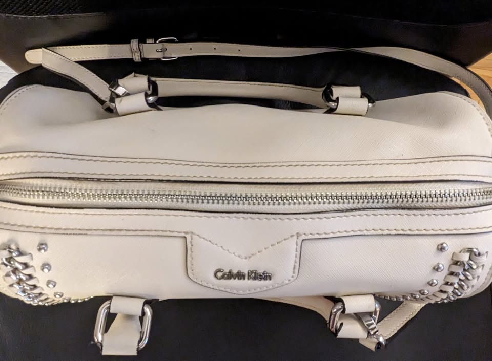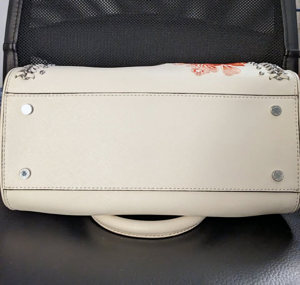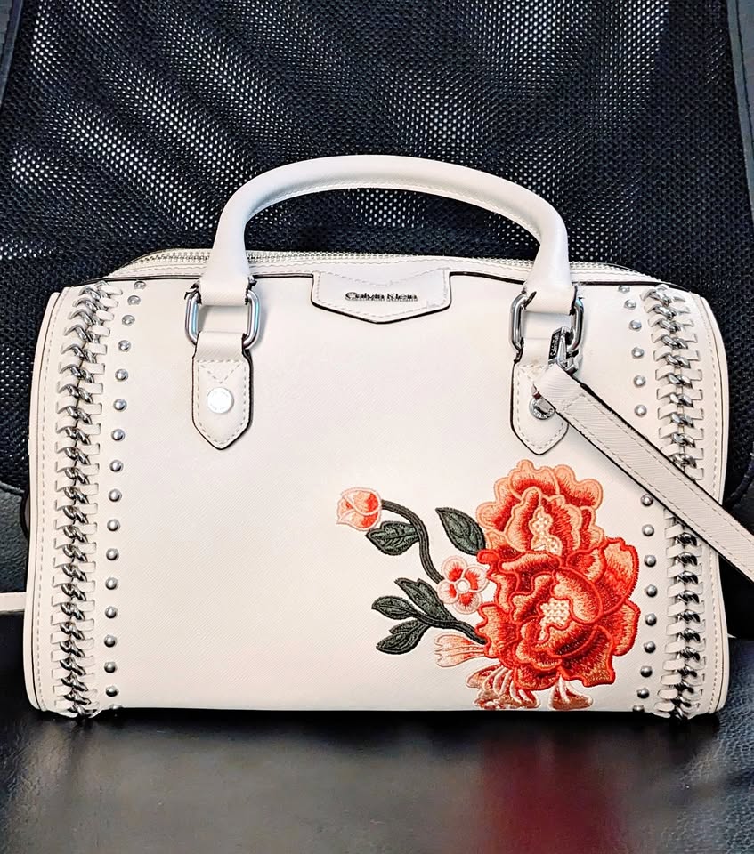Calvin Klein white leather satchel purse with a beautiful embroidered rose detail and edgy chain and stud accents.