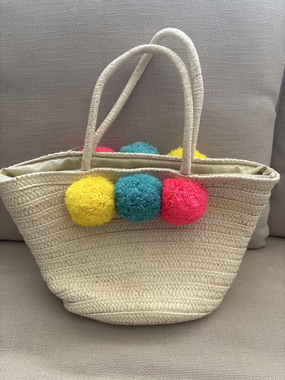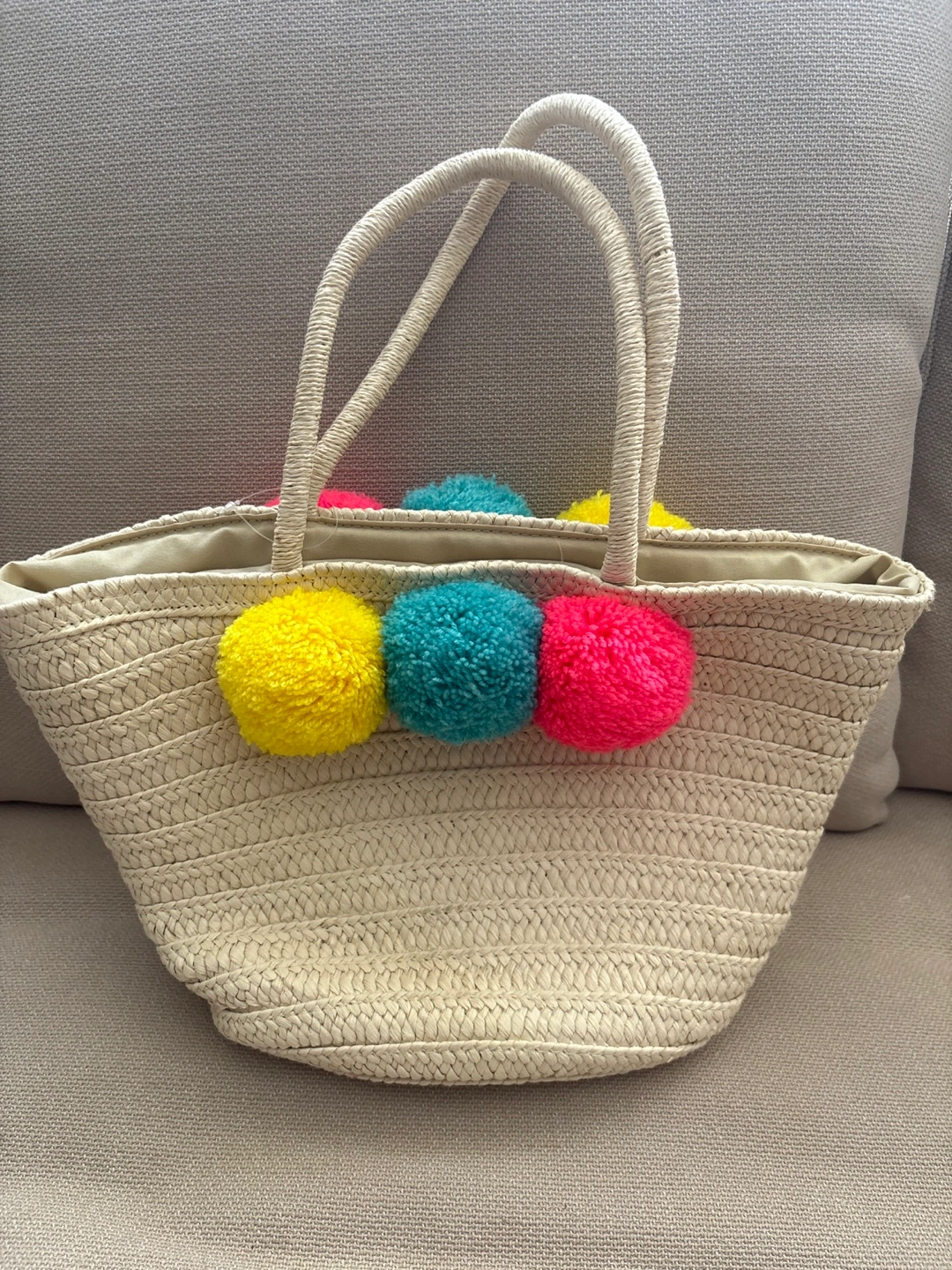 Cute GAP Kids straw tote bag! It's perfect for carrying little treasures or heading to the beach. The bag features fun, colourful pom poms that add a playful touch.