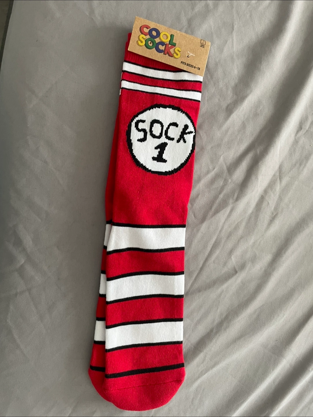 Check out these fun Cool Socks! They're crew socks with a 'Sock 1' design, perfect for adding a bit of whimsy to your outfit.