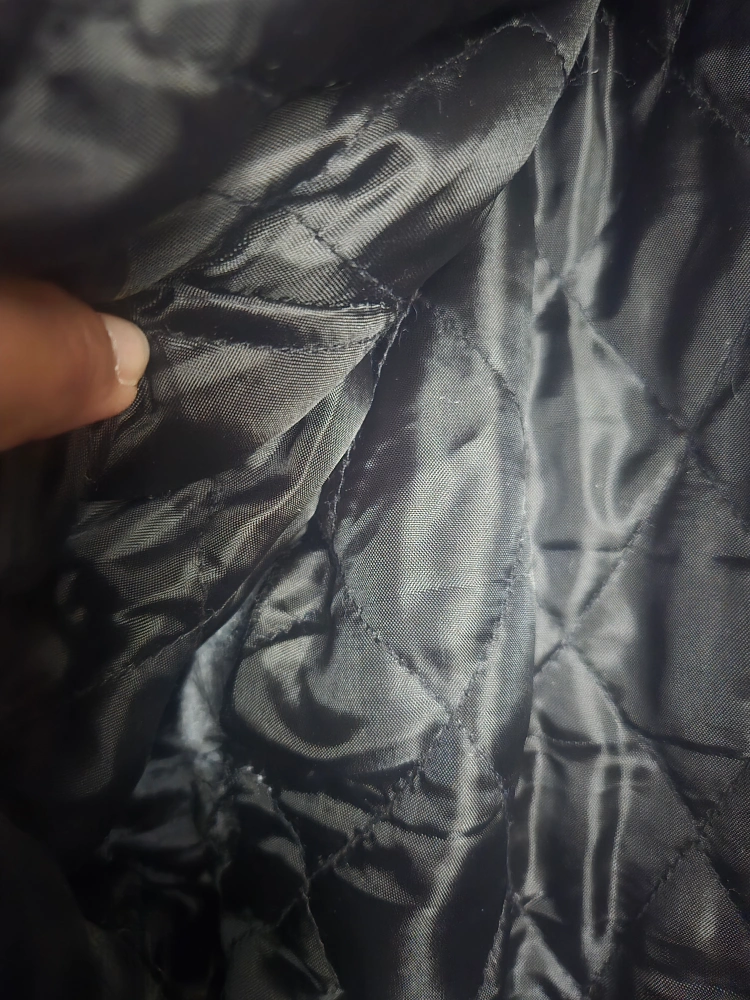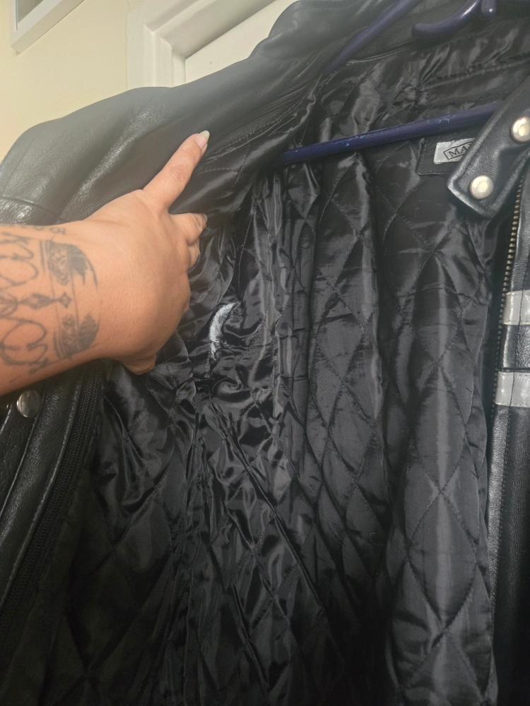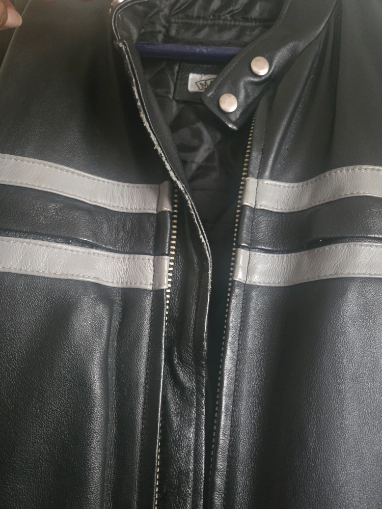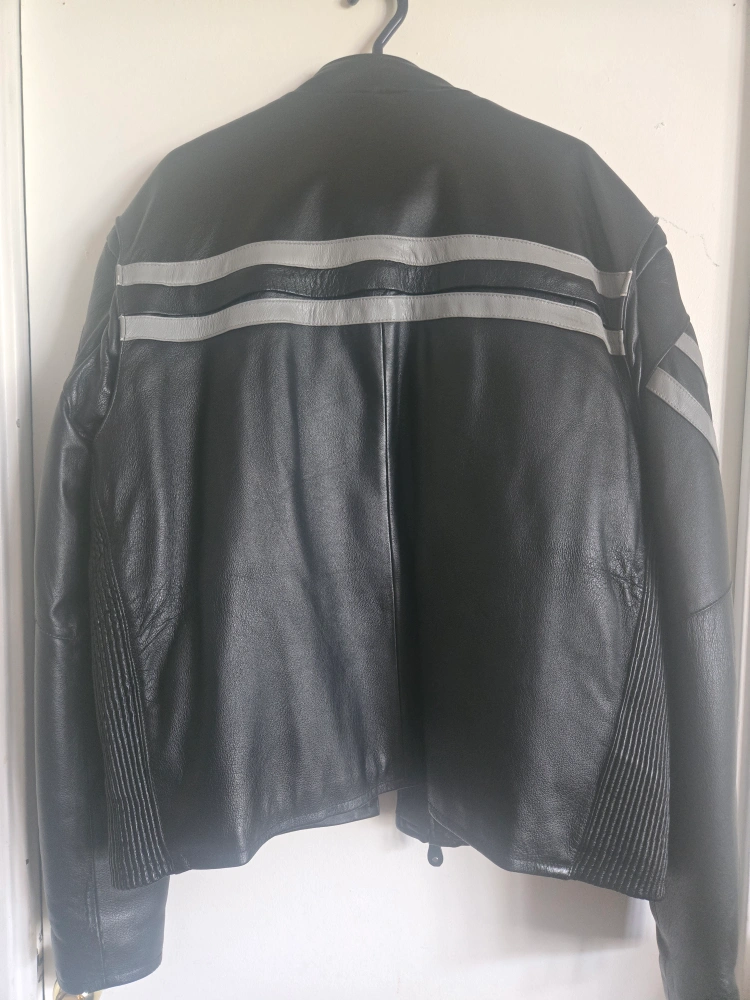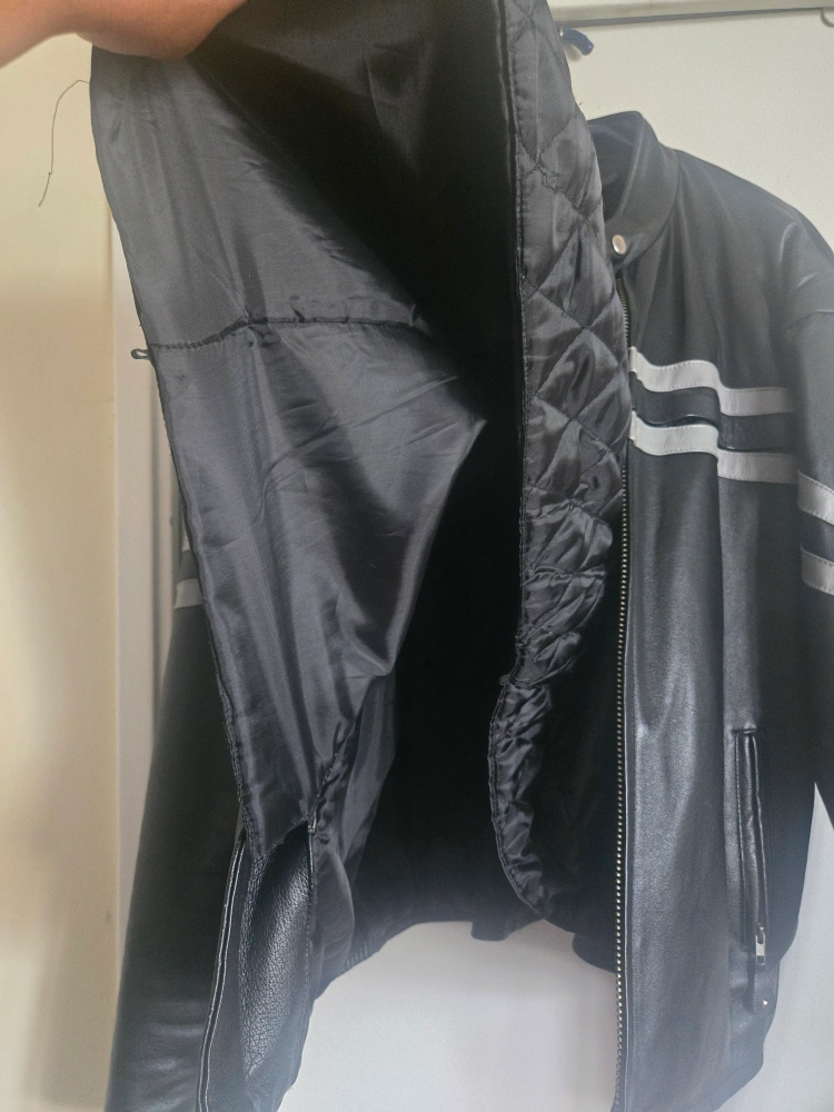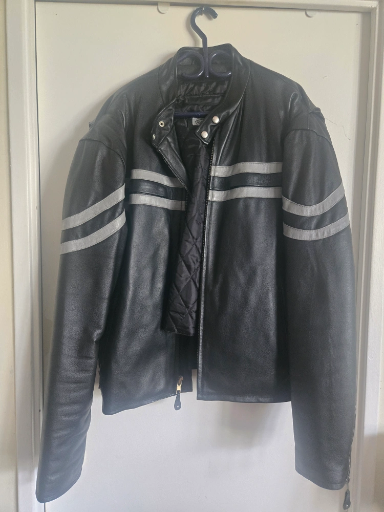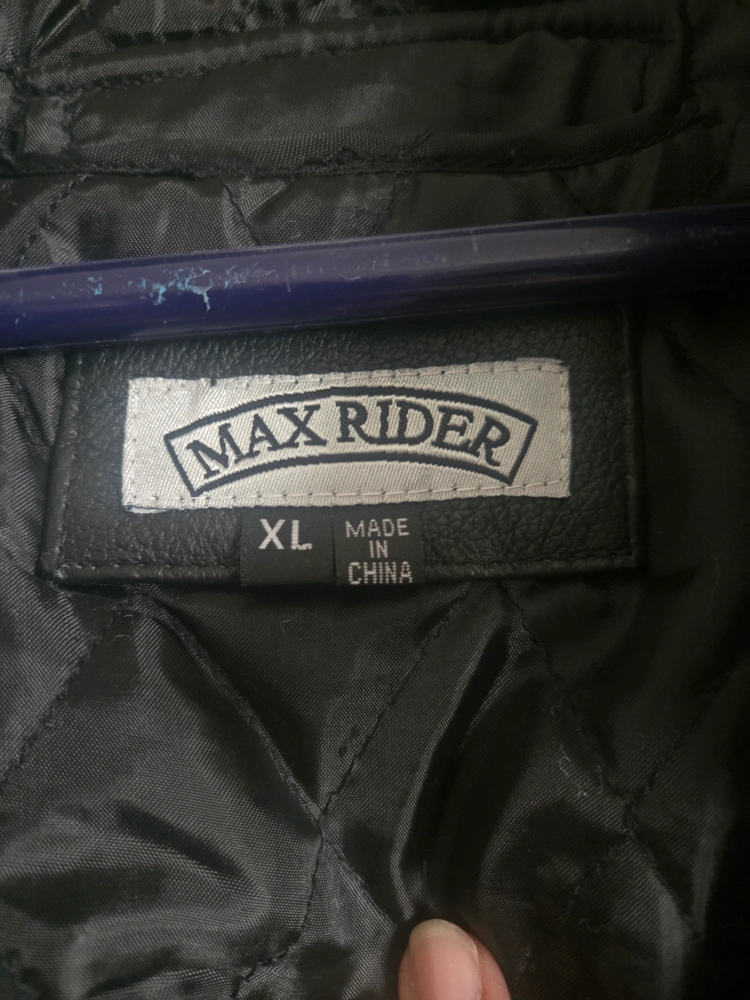 Selling a Max Rider black leather jacket in size XL. It has a quilted lining and silver stripes across the chest and back. Great for motorcycle riding or just a cool look!