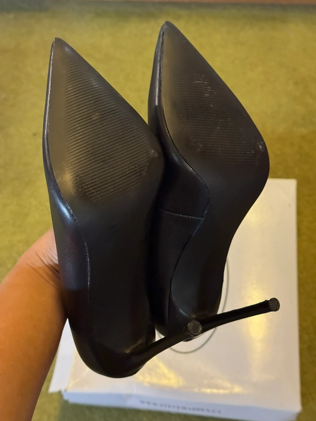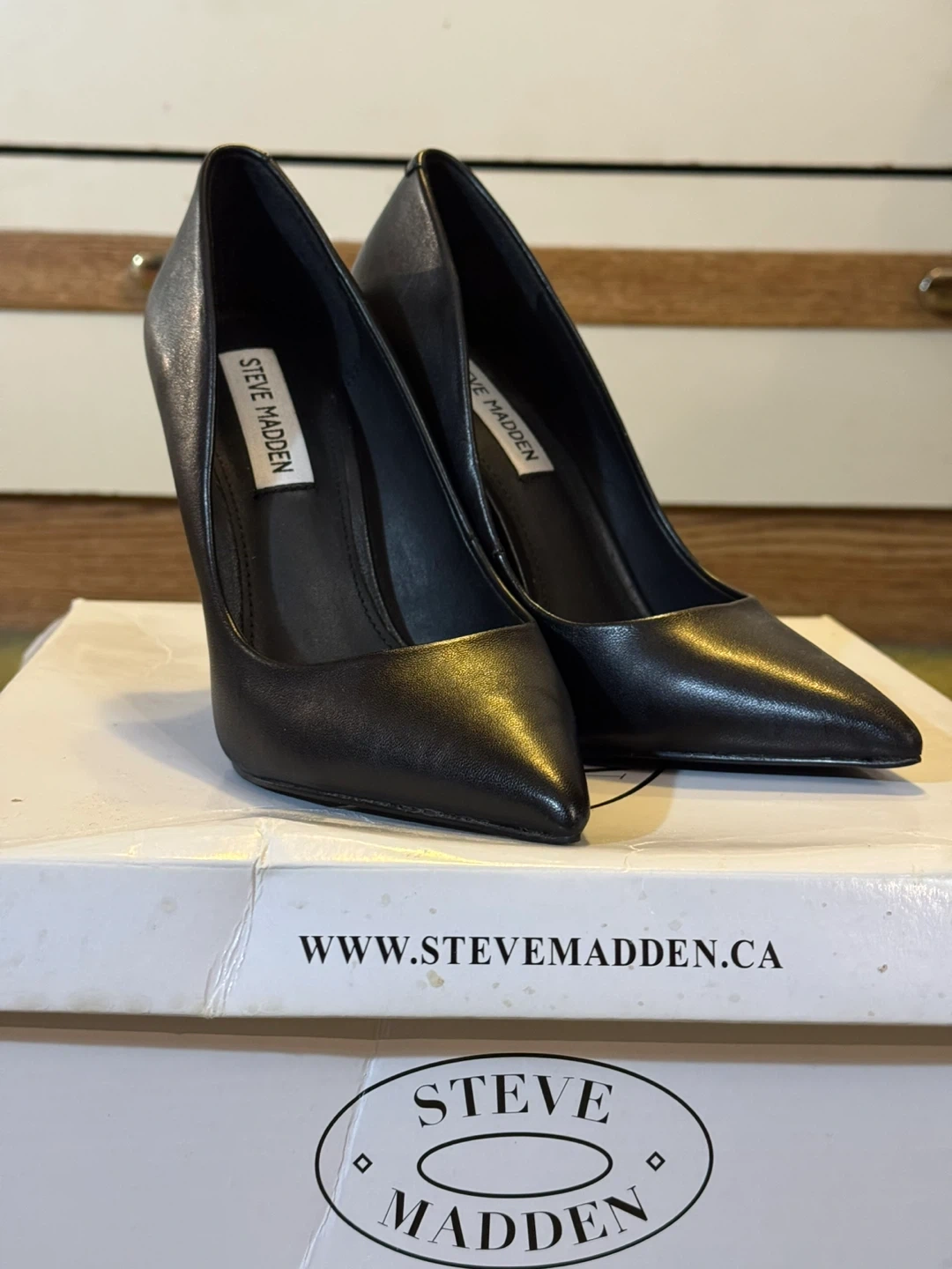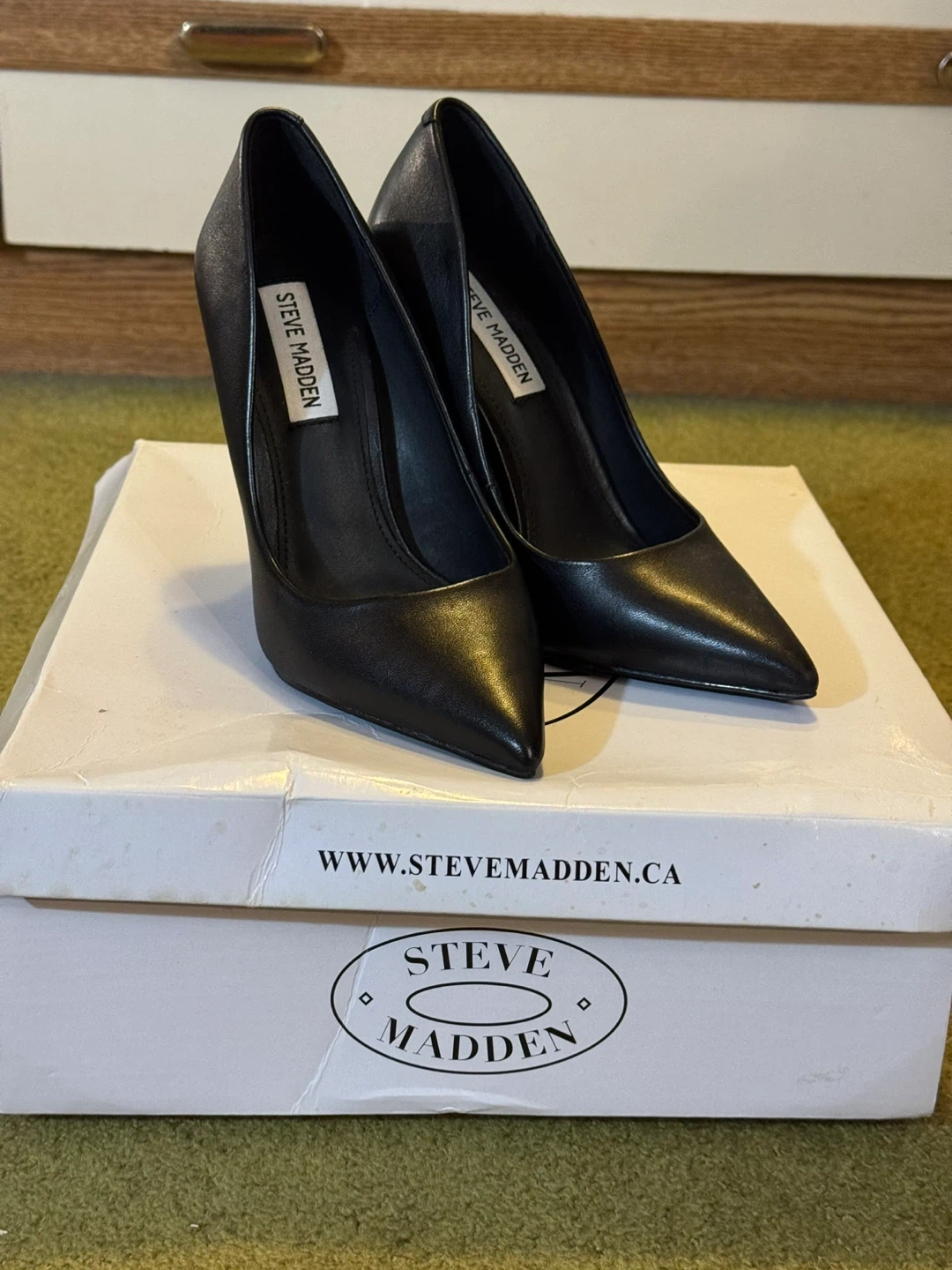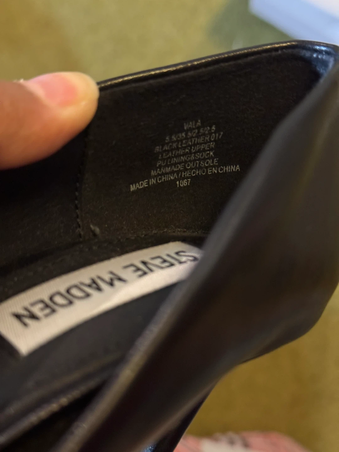 Selling a pair of Steve Madden Vala heels! They're a sleek matte black leather and in size 5.5. The upper is leather, and the outsole is manmade. Comes with the original box!